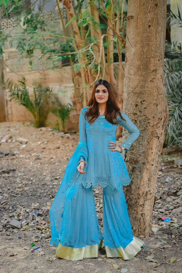 • Chiffon: Chiffon is a lightweight, airy fabric that adds a soft, delicate touch to the Gharara. It is ideal for casual or semi-formal events and provides a graceful, flowing silhouette.