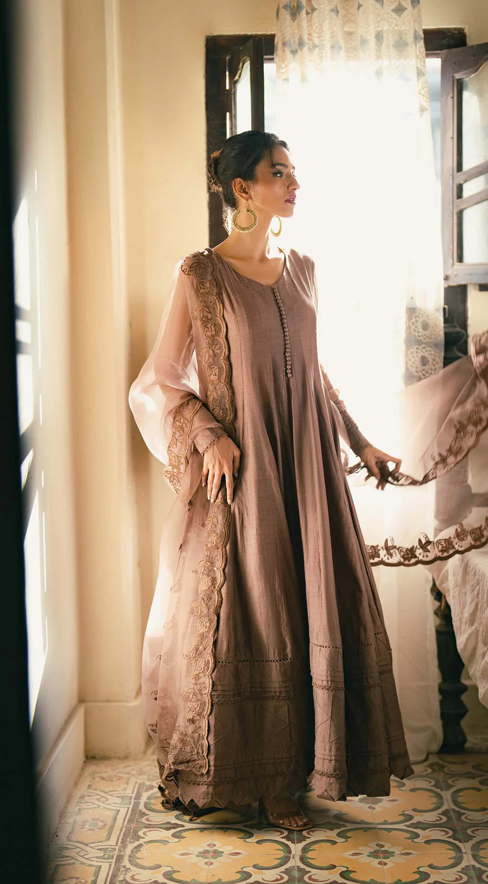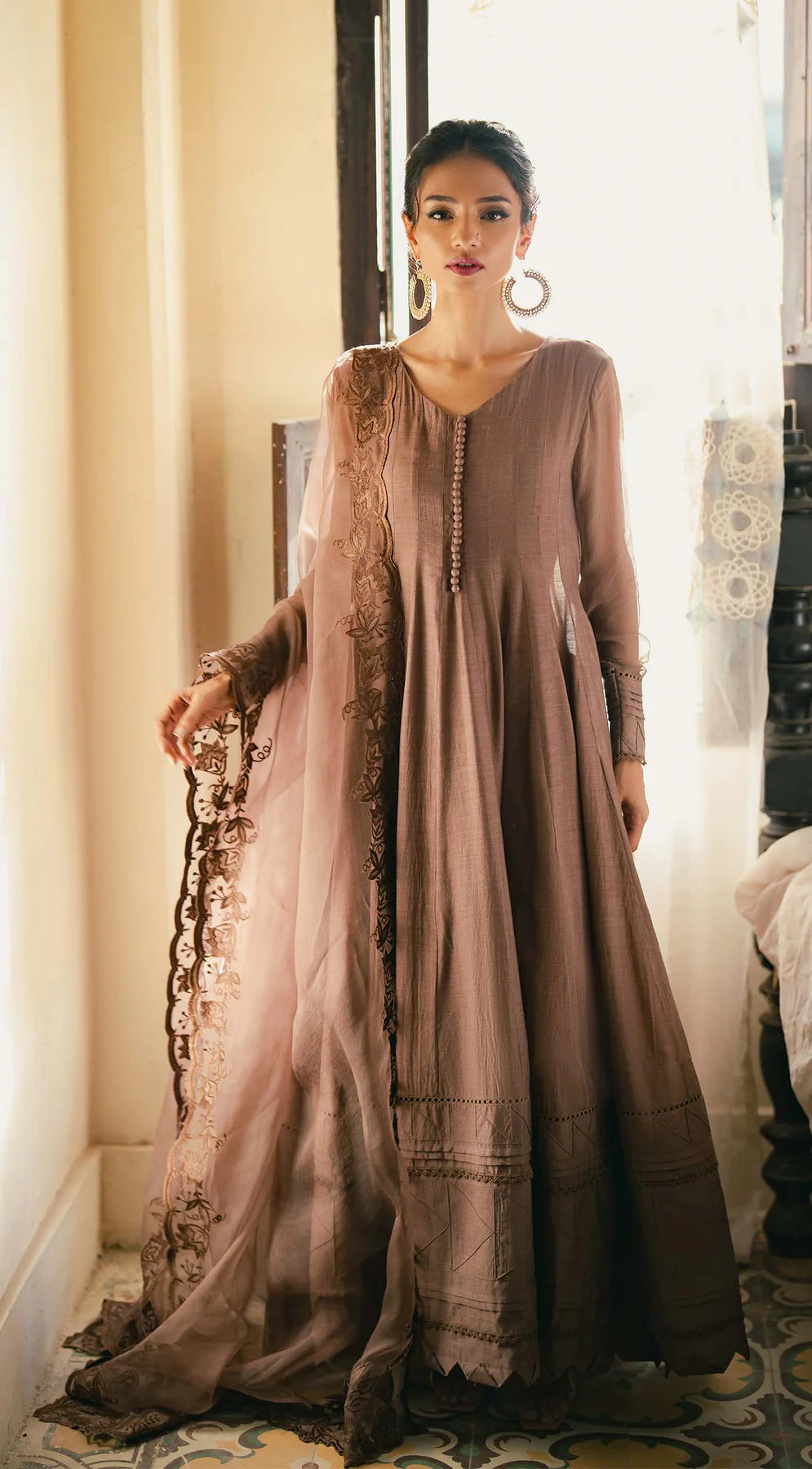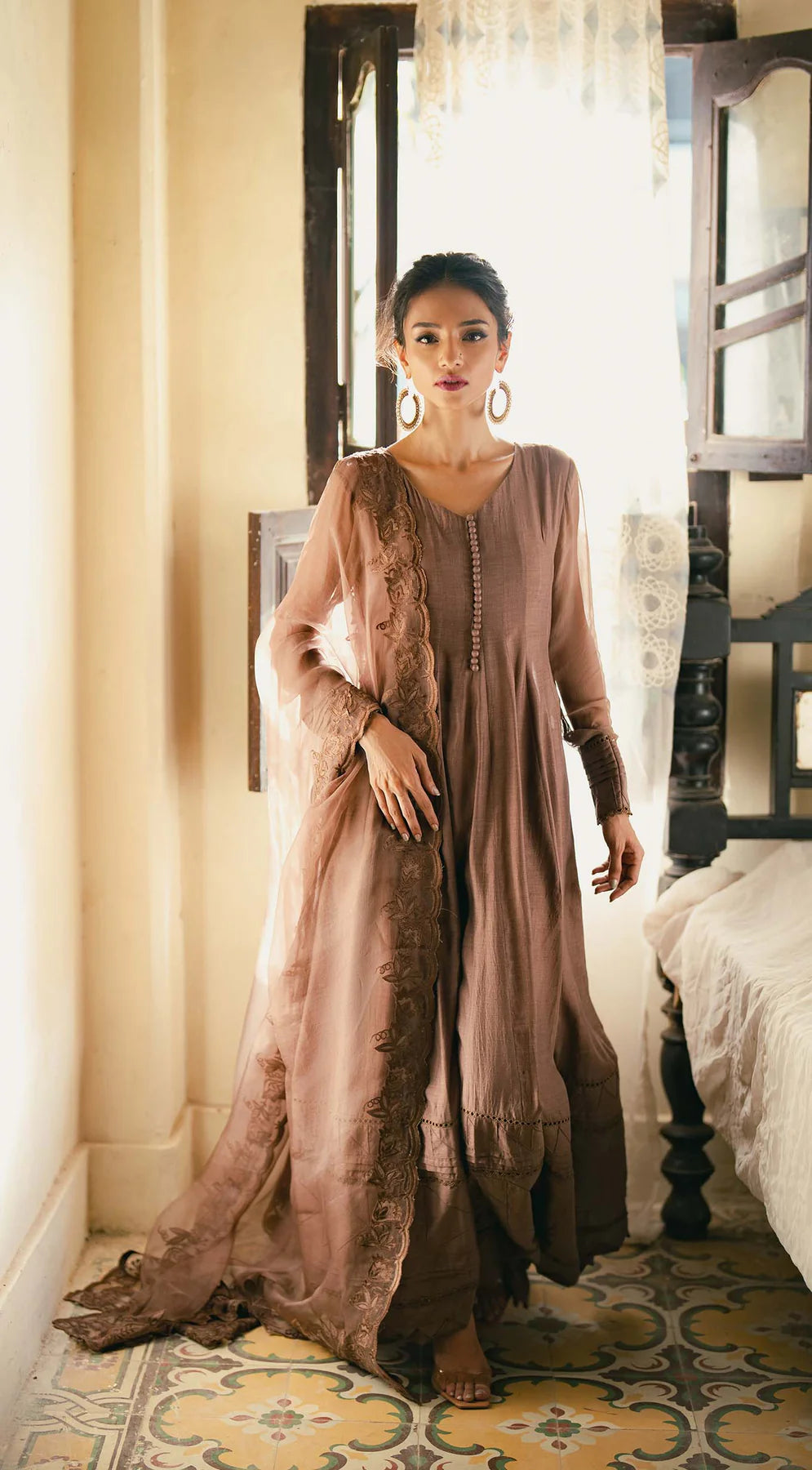 The Brown Khaddi Silk Kalidar is a masterpiece of handcrafted elegance. This luxurious ensemble features textured fabric, intricately crafted with fabric-manipulated borders, and finished with delicate bead knot details.