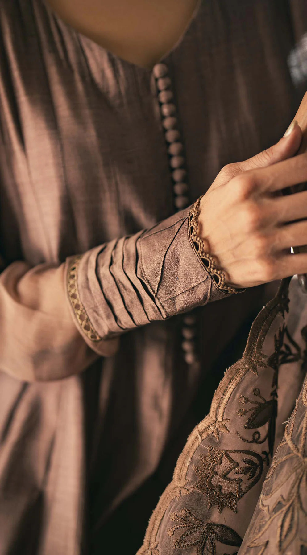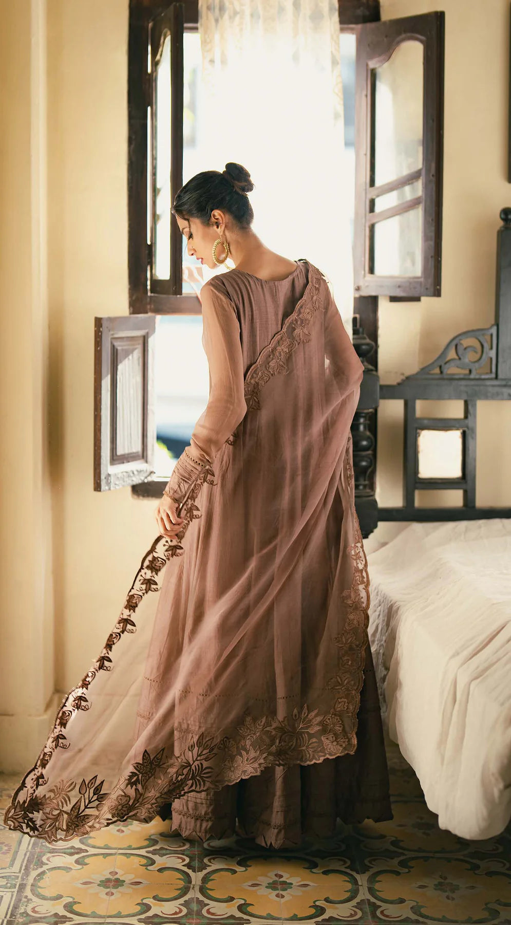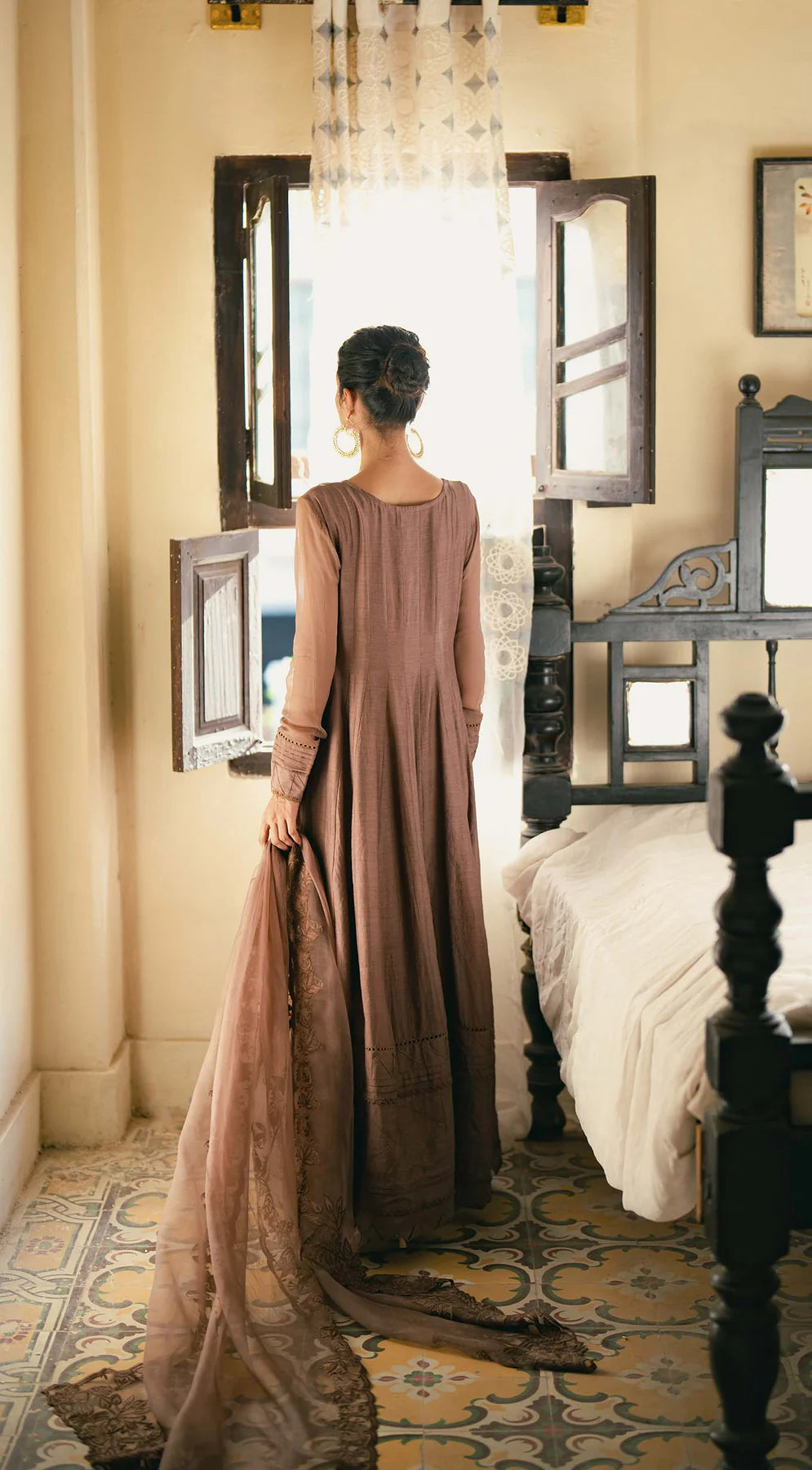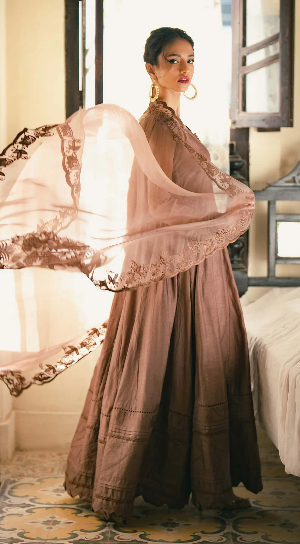 The Brown Khaddi Silk Kalidar is a masterpiece of handcrafted elegance. This luxurious ensemble features textured fabric, intricately crafted with fabric-manipulated borders, and finished with delicate bead knot details.