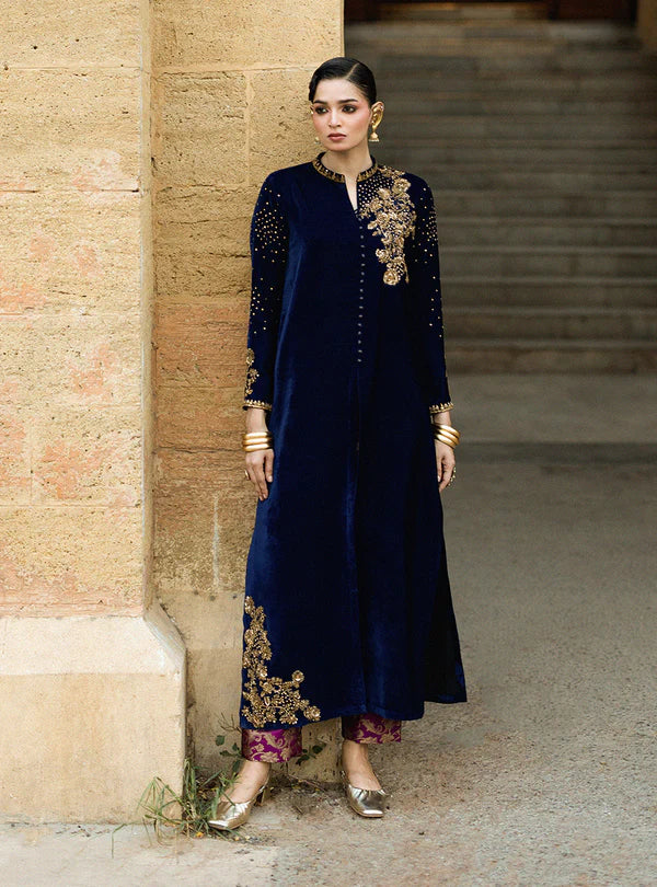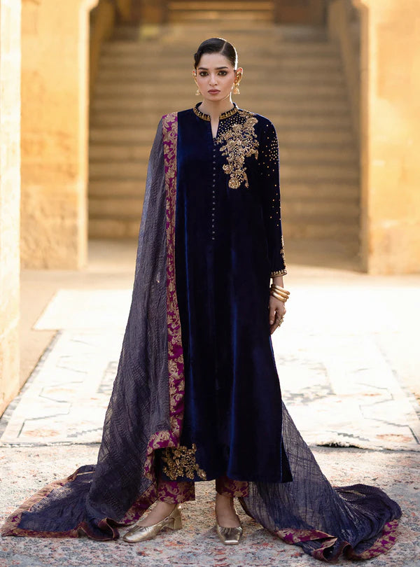 An ensemble that makes you feel like royalty, draped in magnificent beauty. Crafted from the most exquisite Deep Navy Blue Velvet, this piece offers a silhouette of sophisticated grace, with a luxurious weight that feels truly special. The magic unfolds in the breathtaking hand-embellished details: intricate gold dabka and delicate stones cascade across the neckline, sleeves, and side panels, sparkling with an artisanal brilliance that speaks of heirloom quality. Paired with luxurious jamawar trousers in a rich fuchsia-gold print, and a sheer mesuri dupatta with jamawar borders