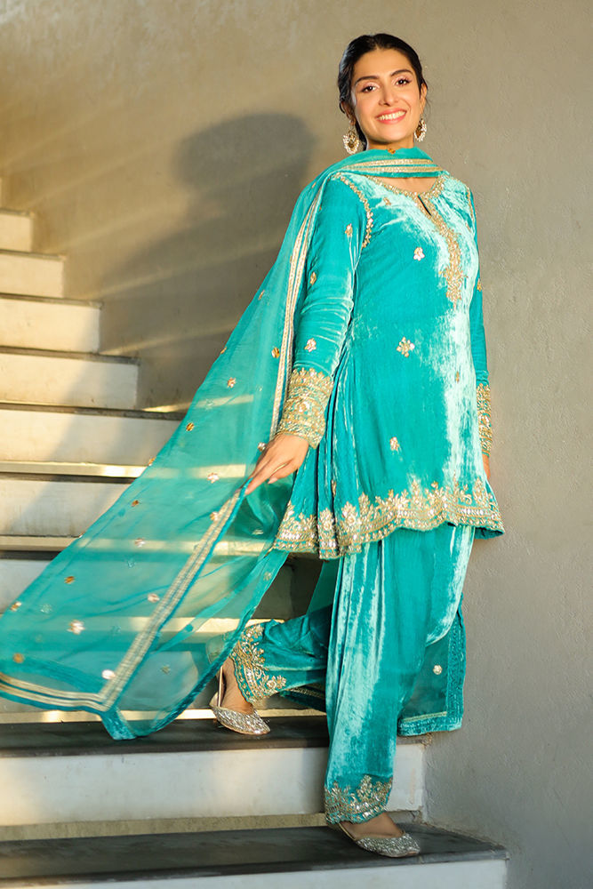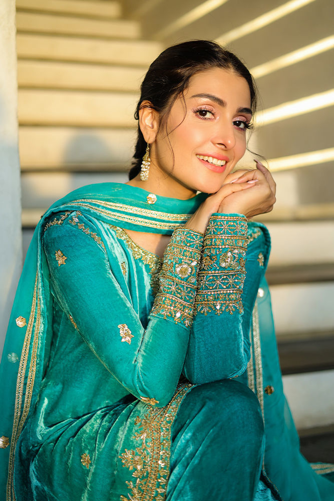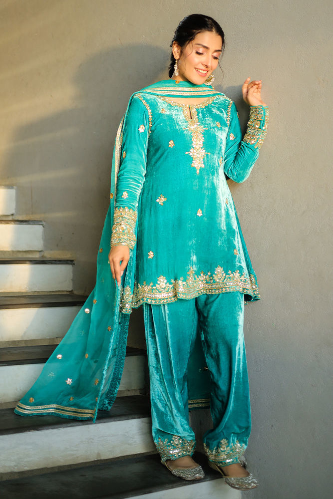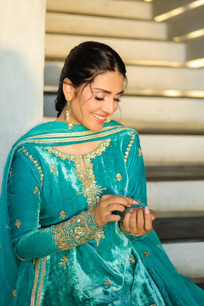 Chand Tara” is a short flared shirt, heavily adorned with gold embellishments and gota work, paired with a loose-fit shalwar with detailed embellishments to give that traditional look. It comes with a pure organza dupatta with a delicate gota borders and botis. Pair it with your favourite khussas for an effortless choice to any intimate ceremony!