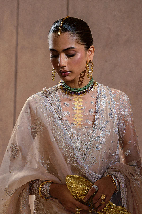 - A nude beige raw silk front - open shirt with plunging halter neckline, fitted organza sleeves, gradient embroidered neckline and white and silver motifs framed with a waved border.