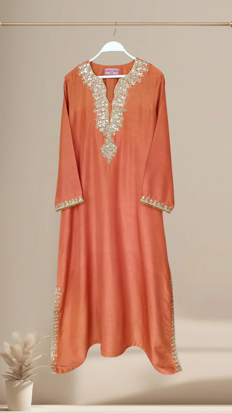 Description: Hand Embellished Korean Silk Kaftan with matching Pants