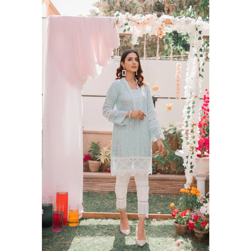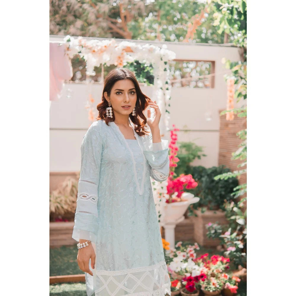 Be the epitome of elegance with our icy blue embroidered cotton net shirt. Beautiful in its simplicity , the delicate kurta in a lovely cool hue is embellished with handwork floral motifs , pearls , crystals and delicate laces . “Liya Blue” kurta is paired with Celestial pants adroned fabric manipulations and laces