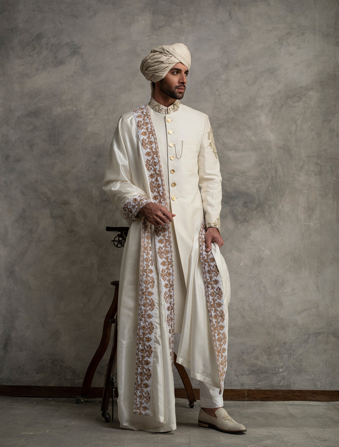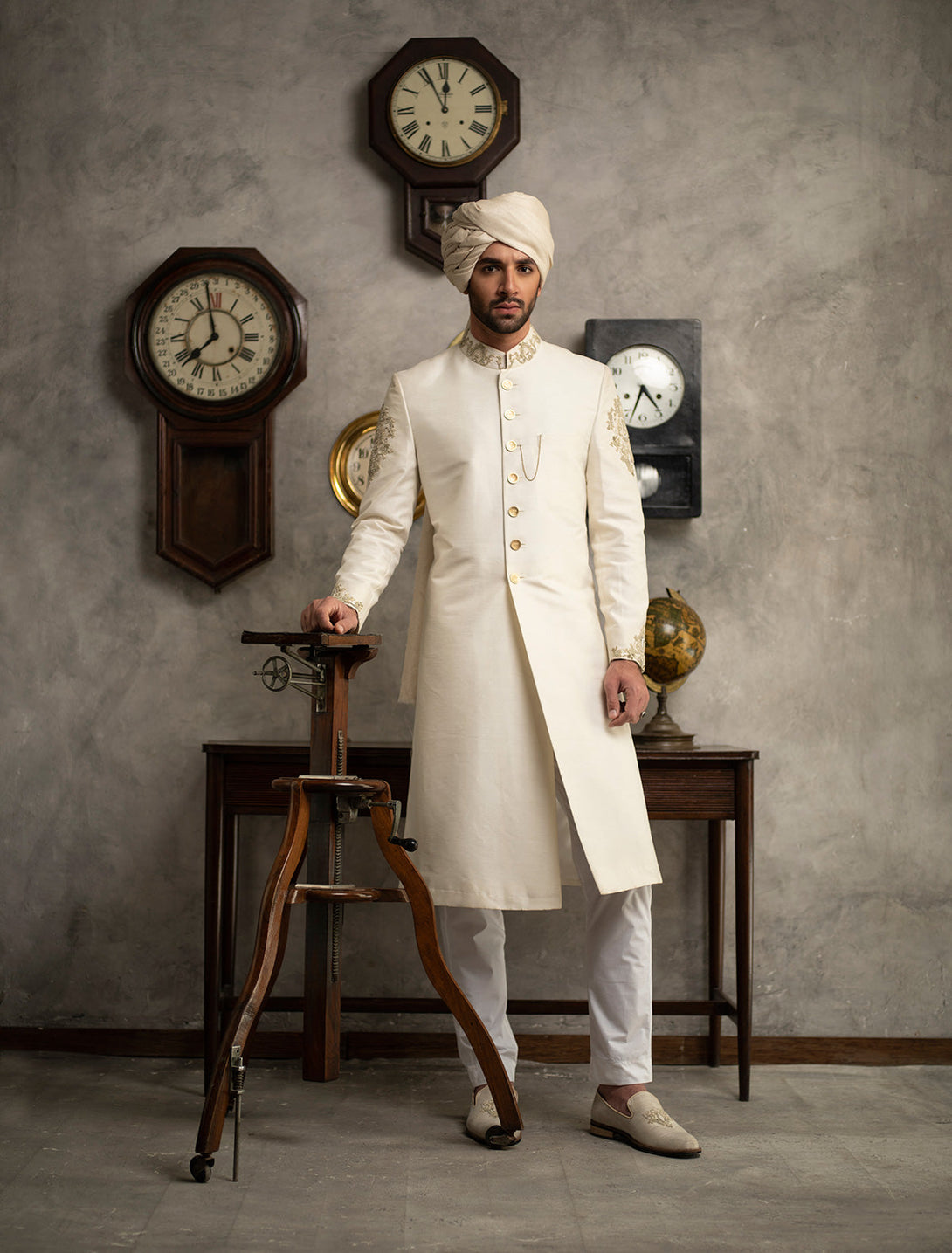 - Off white Raw Silk Sherwani with golden embroidery on collar, cuff, arm and back