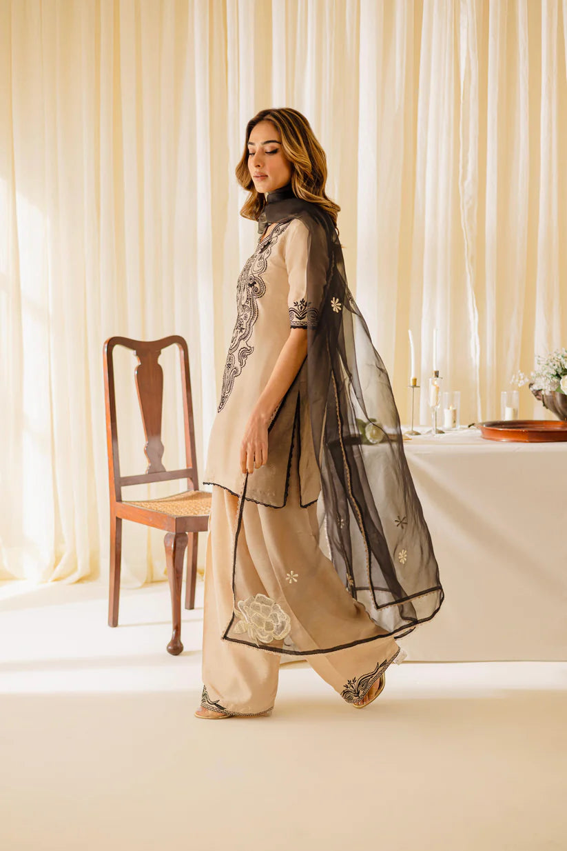 Nothing like a monochrome ivory and black silk ensemble for Eid. The trendiest cut, an all time favorite colour combination, a statement pure organza duppatta, - “The Rhea Set” has it all.