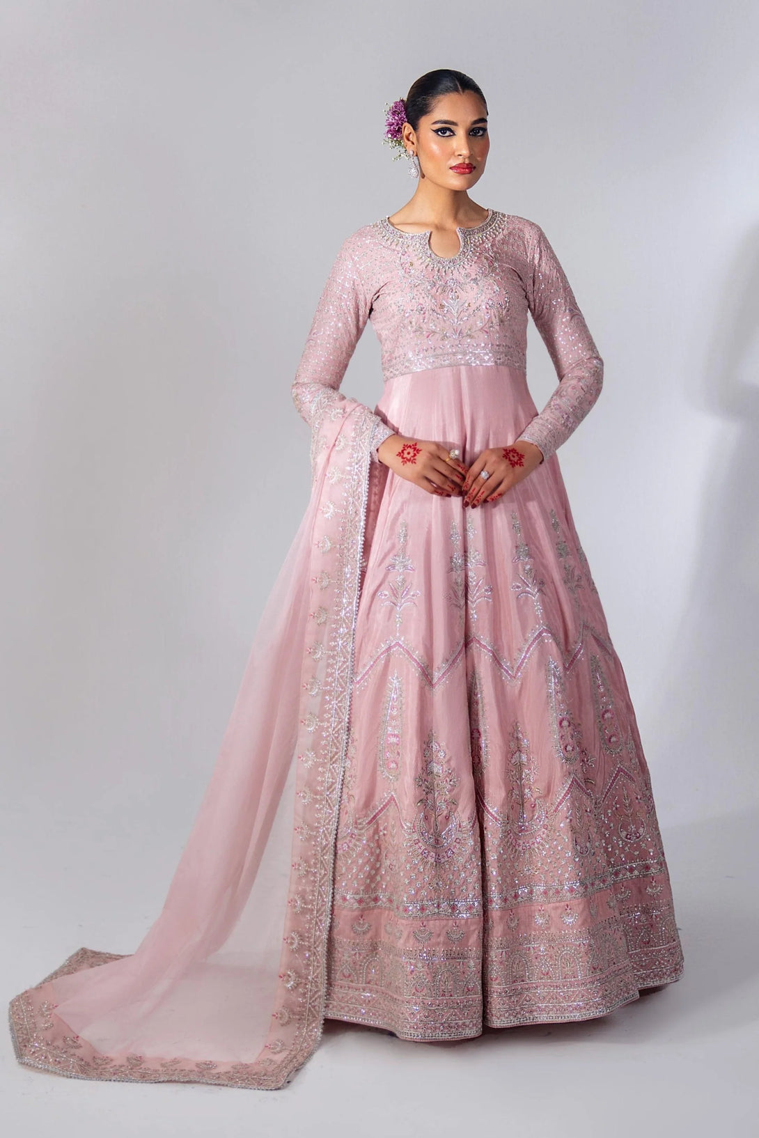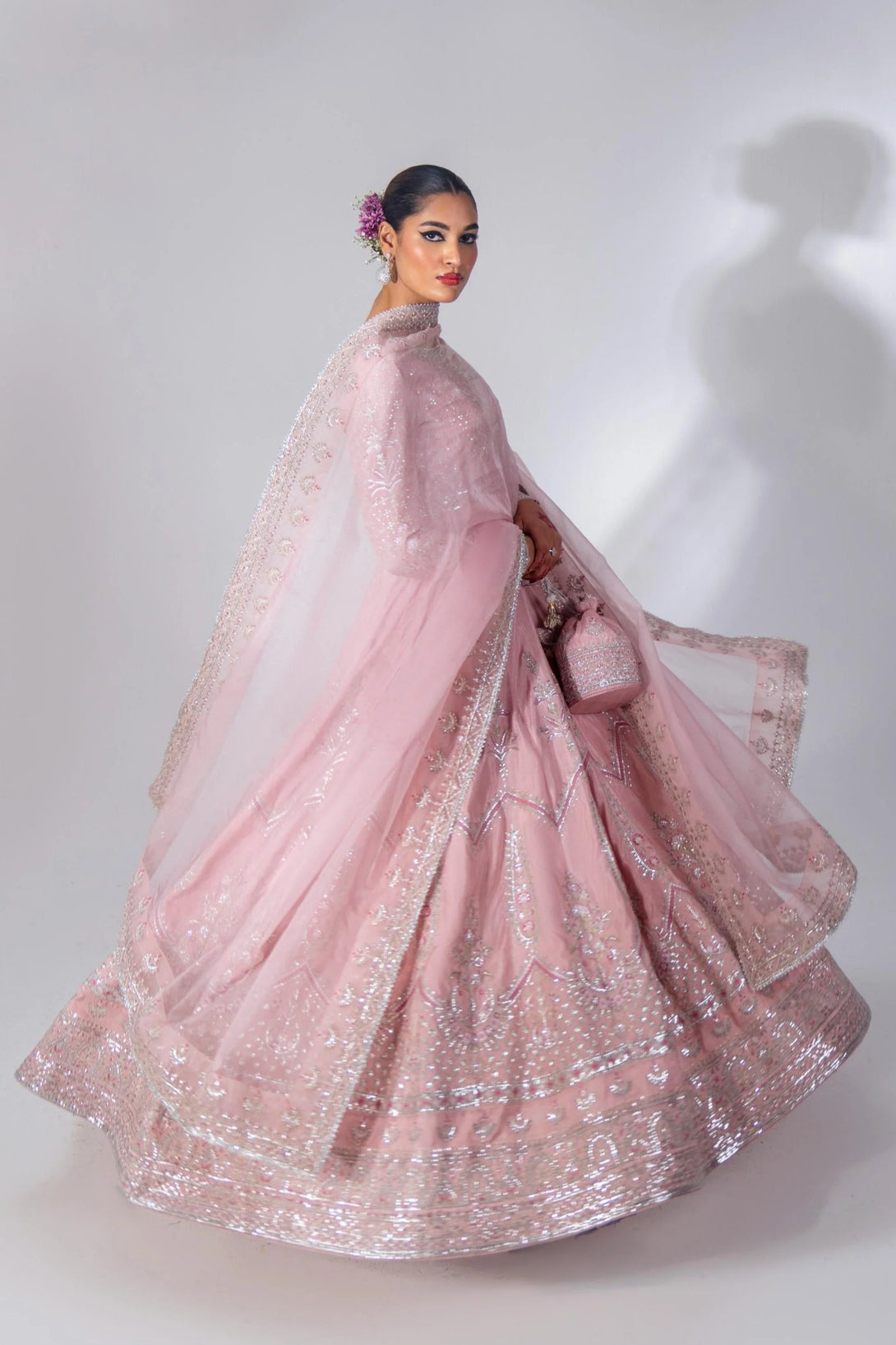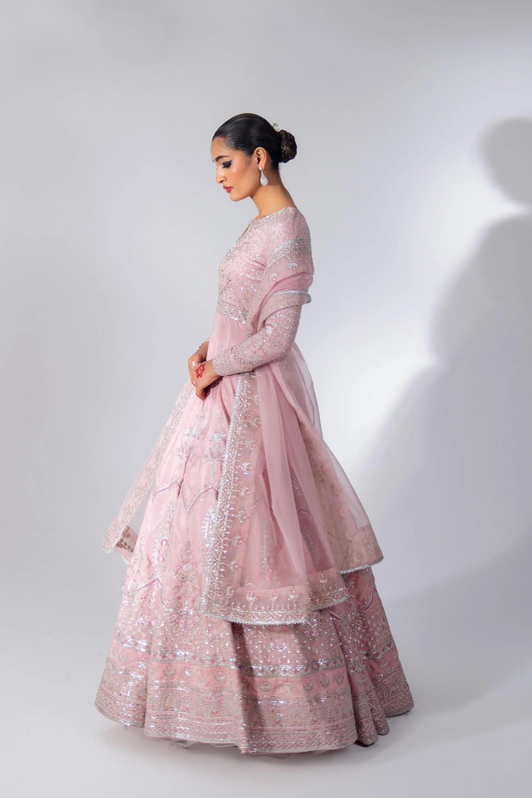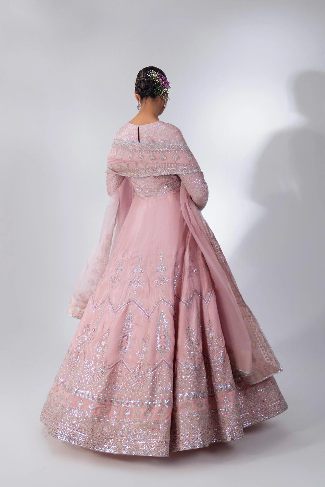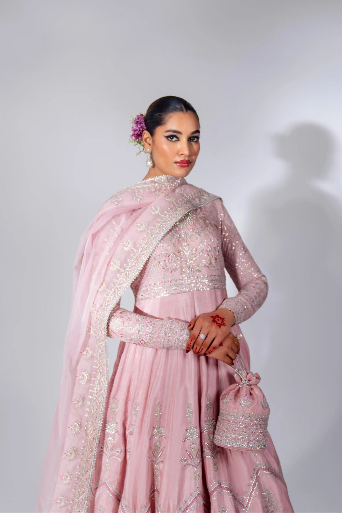 This pastel lilac pink rawsilk pishwas fuses tradition with modernity, featuring rich ethnic motifs, heavy embroidery, and sequins for a striking festive look. The intricately hand-embellished neckline adds refined detail, while the organza dupatta, finished with four-sided borders, complements the ensemble beautifully. Complete your look with a matching potli pouch.