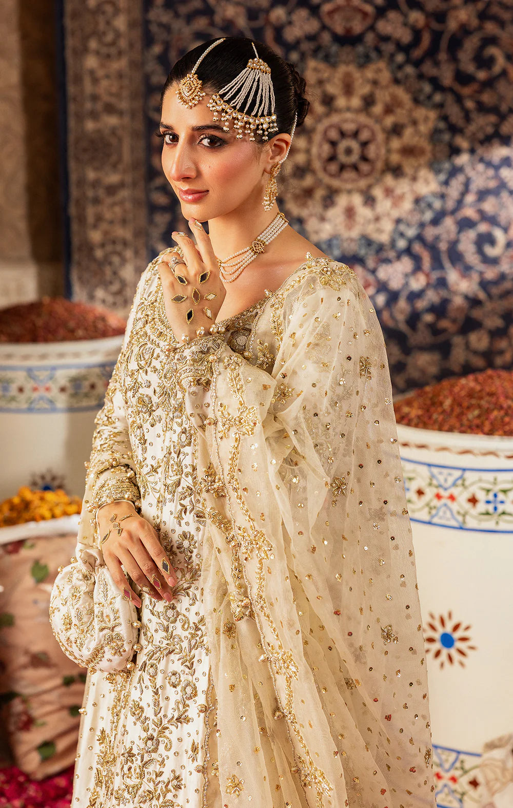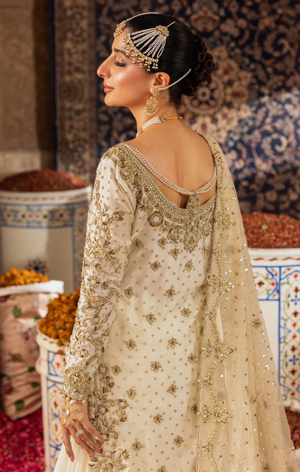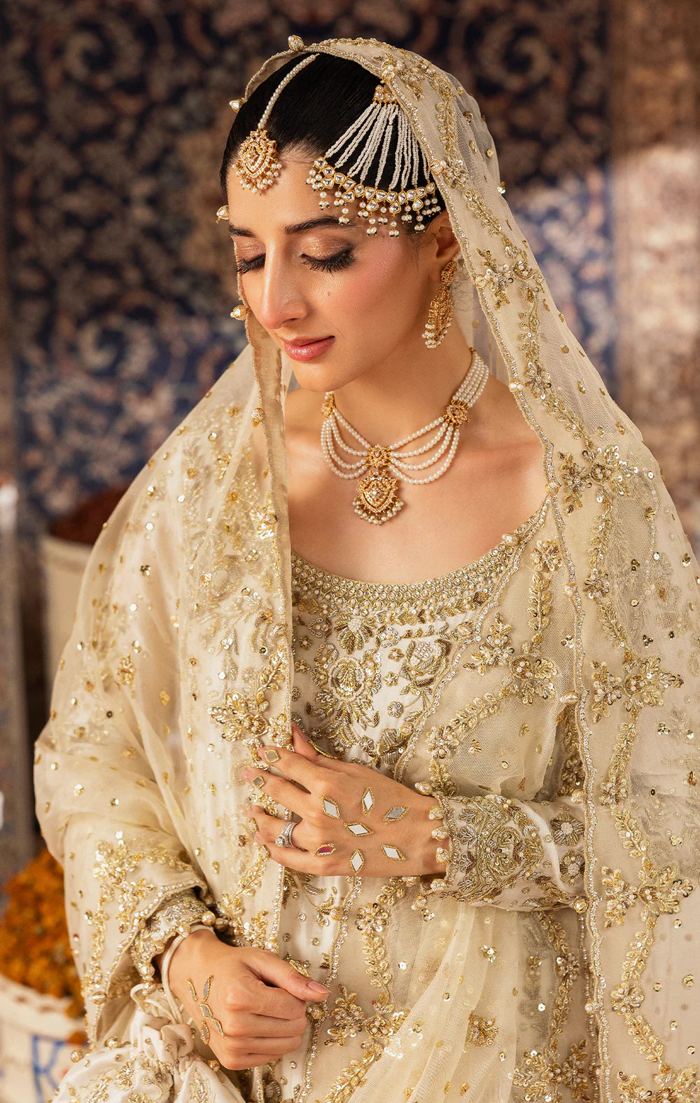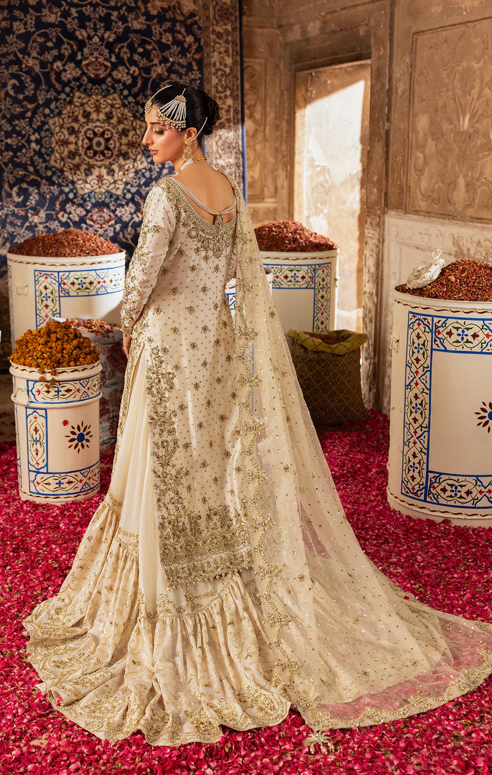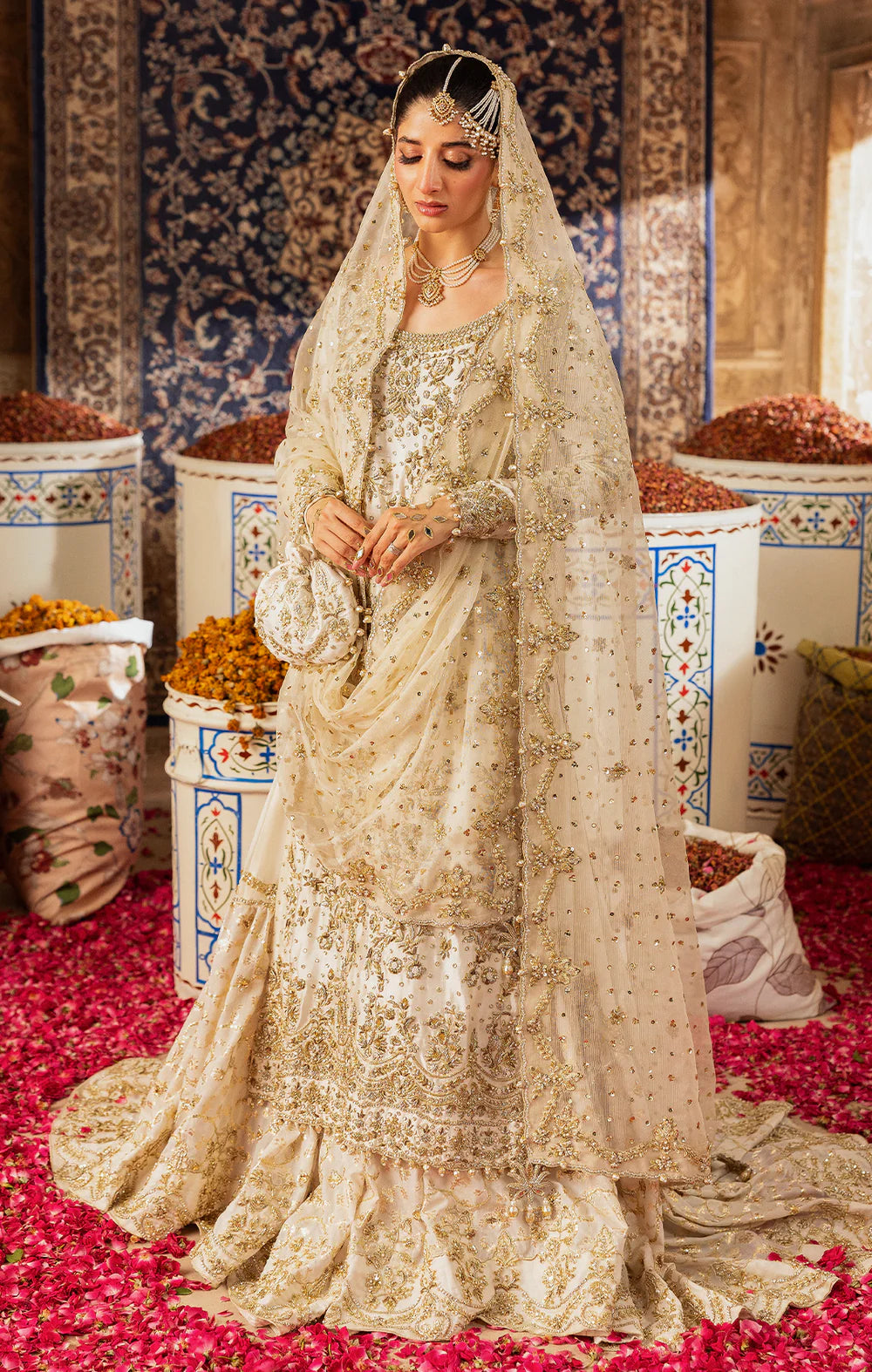 A carefully chosen shade of ivory good is adorned with stunning gold and bronze handwork. The silhouette of the outfit with high slits makes it the ultimate flattering silhouette. The pure silk shirt is embellished with intricate zardozi, dabka, sequins gold and silver zari, naqshi, pearls and betki. It has a heavy floral trellis on the front and back which gives the bride regal feels. This elegant shirt is complemented with a farshi gharara made in zari witj hand crafted embellished with delicate and beautiful gold handwork done by our expert artisans. The exceptionally beautiful bridal is an absolute showstopper. The organza net dupatta has a thick and heavy intricate scalloped border and chun which gives the dress fancy finish that will no doubt leave everyone amazed.