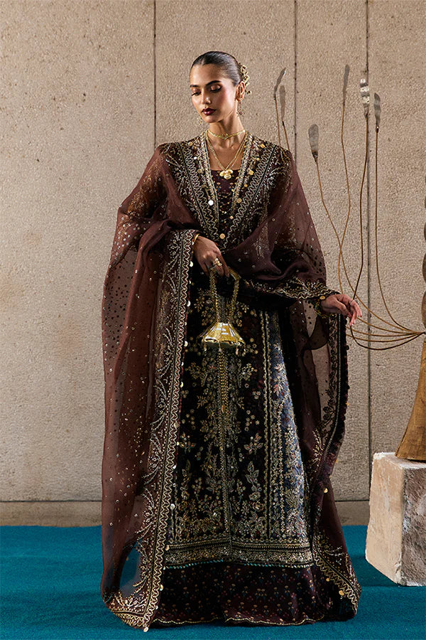 - Sharara in printed grip silk, dark brown tone with scalloped edges.