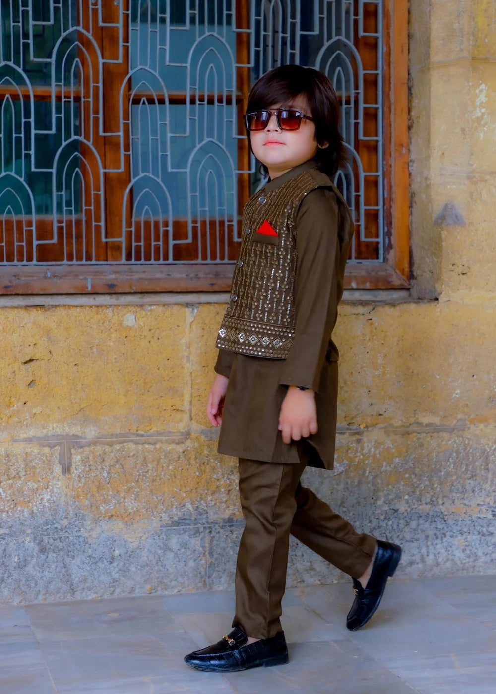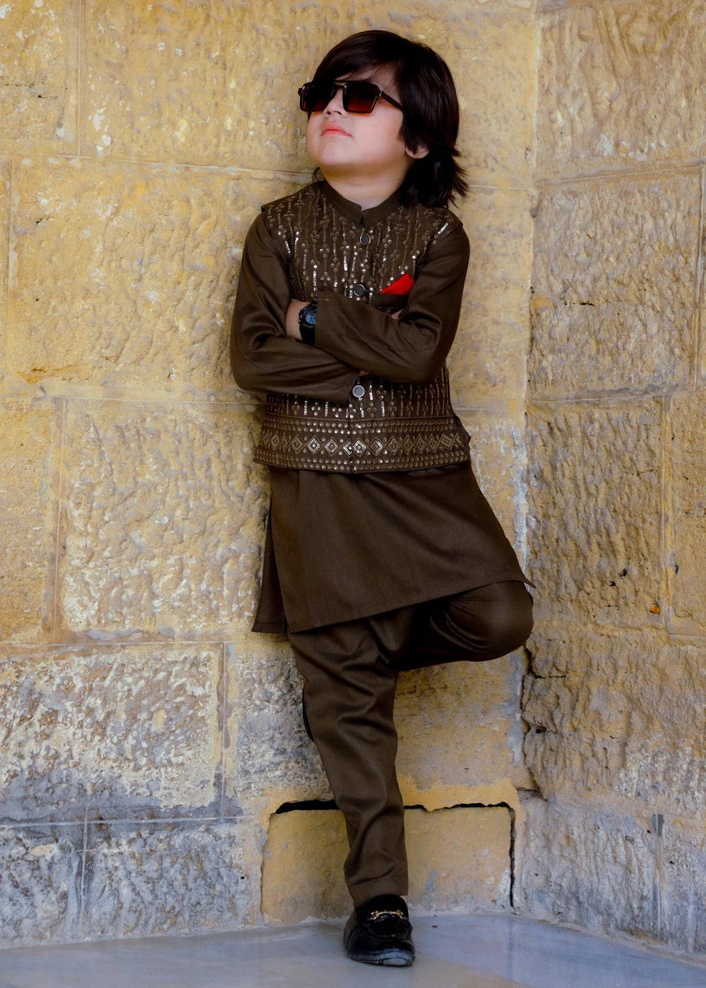 Waistcoat Suit Elevate your formal style with our elegant waistcoat suit. Crafted from high-quality [fabric], this three-piece ensemble includes: Disclaimer: There is no colar in 1-2 Yrs to Avoid Allergy for Baby skin and there is no pocket in waistcoat in 1-2 yrs size due to size issue - Color: Maple Brown - Fabric: blended embroidered waistcoat and soft wash and wear shalwar kameez - Size: 2-3 yrs to 12-13 yrs - Style: Formal Experience the perfect blend of style, comfort, and sophistication with our waistcoat suit.