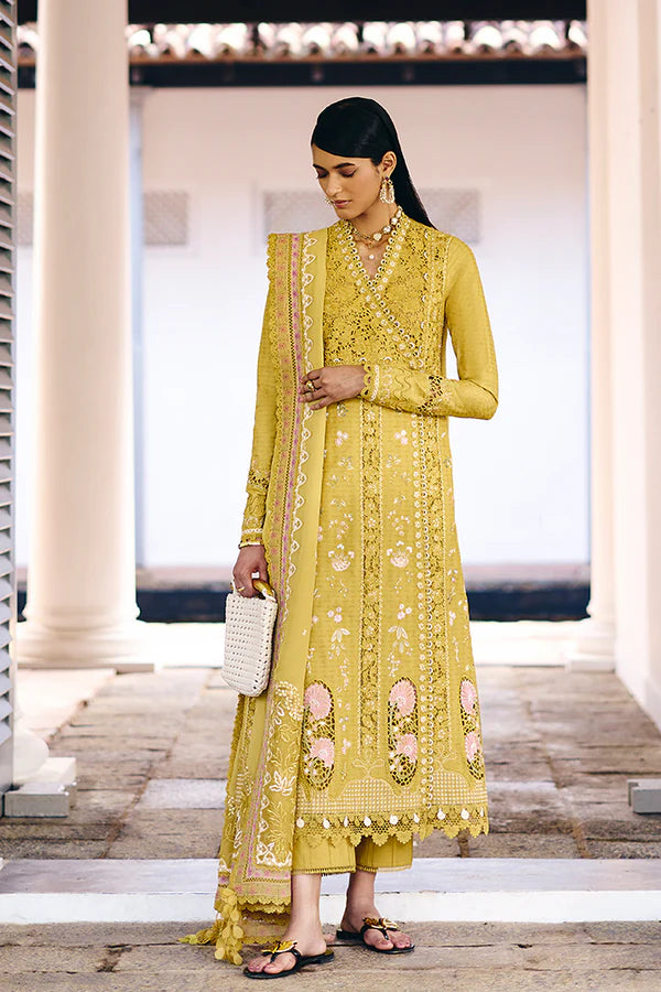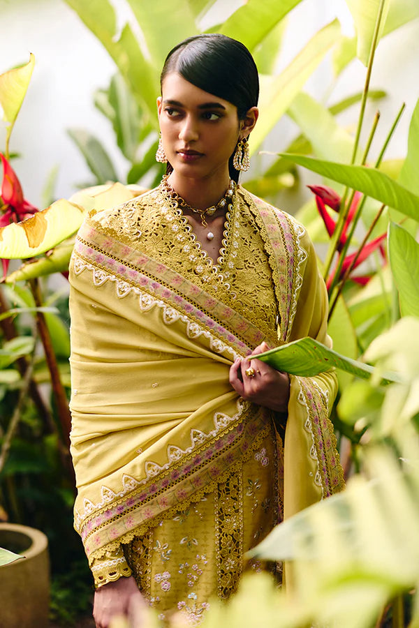 • The dupatta is made of chiffon in the same honey yellow tone. It has a printed and embroidered border on all four sides, along with embroidery lacing the edges. Complementary tassels complete the overall look.