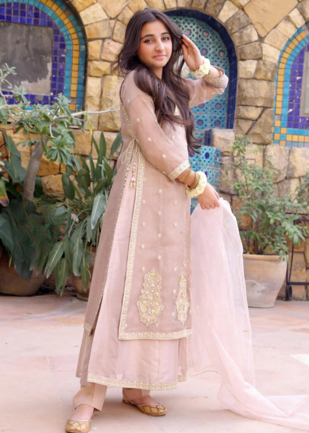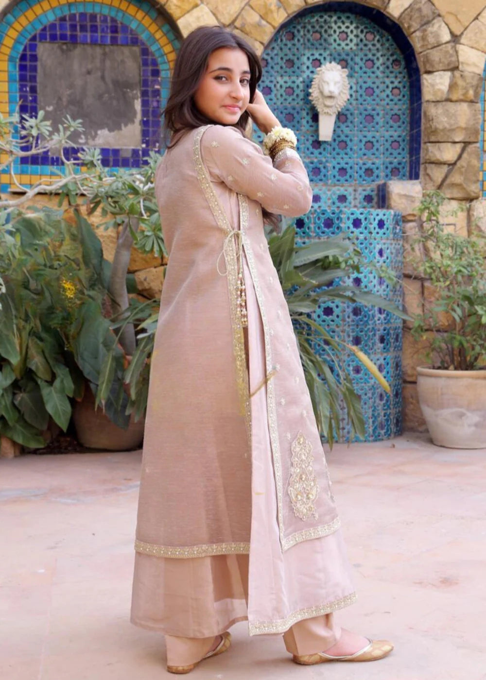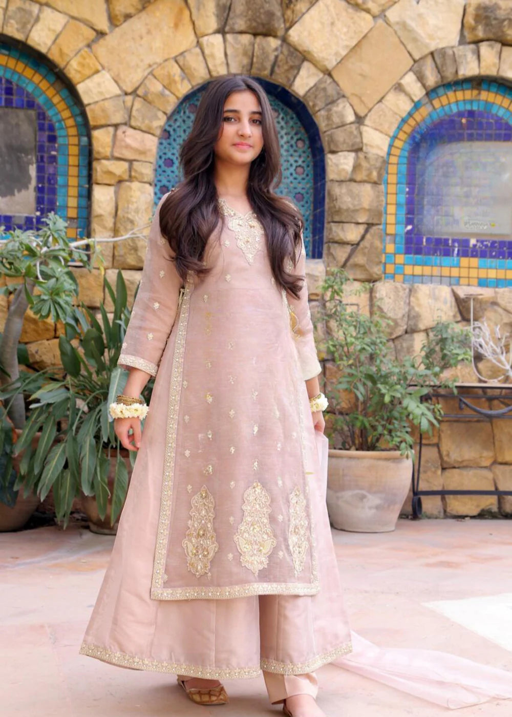  Computer Embroidery on Khaddi net upper side tasals and pure banarsi tissue Inner.  Capri style trouser of Satan chiffon golden dupatta