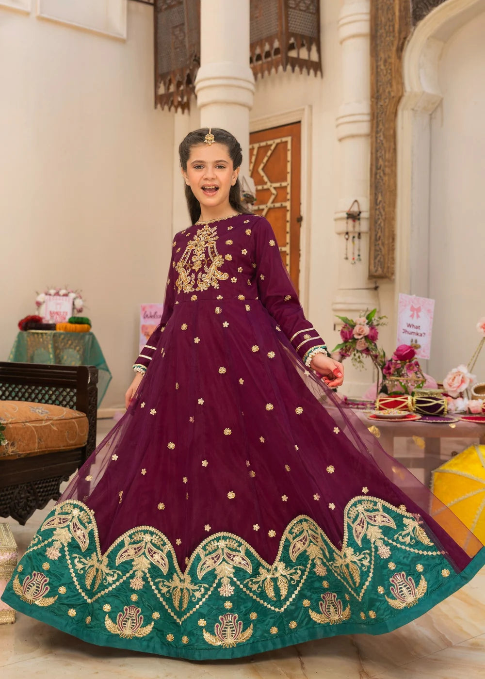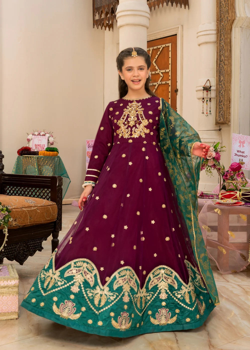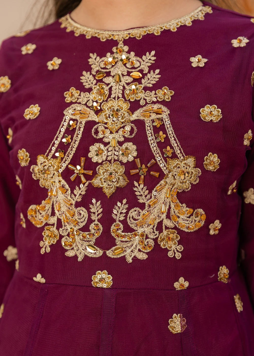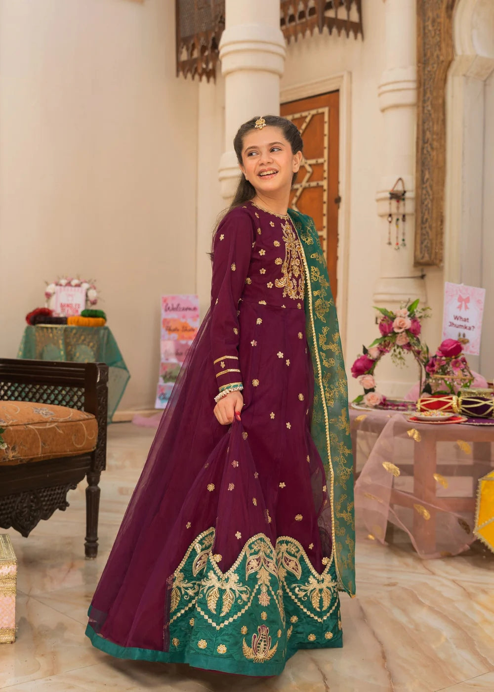 A net pishwas adorned with tilla and thread embroidery, enhanced with intricate handwork of beads and sequins. Paired with a gold-printed organza dupatta, the outfit is stitched with grip lining and finished with a cancan border for added volume and elegance.