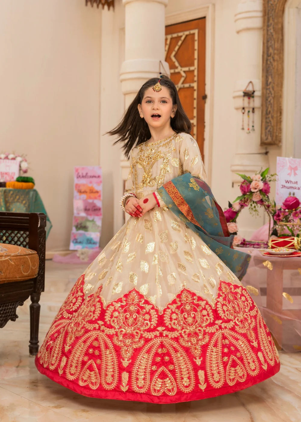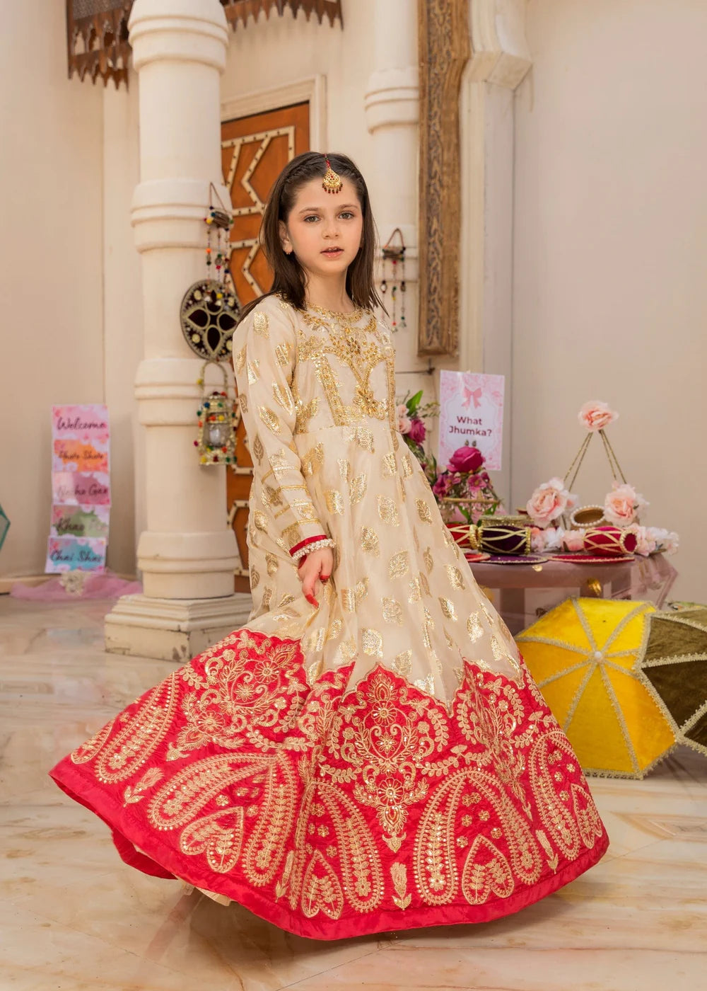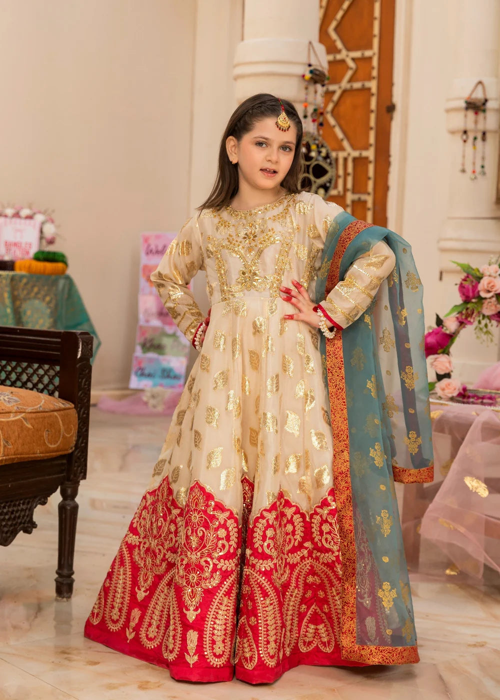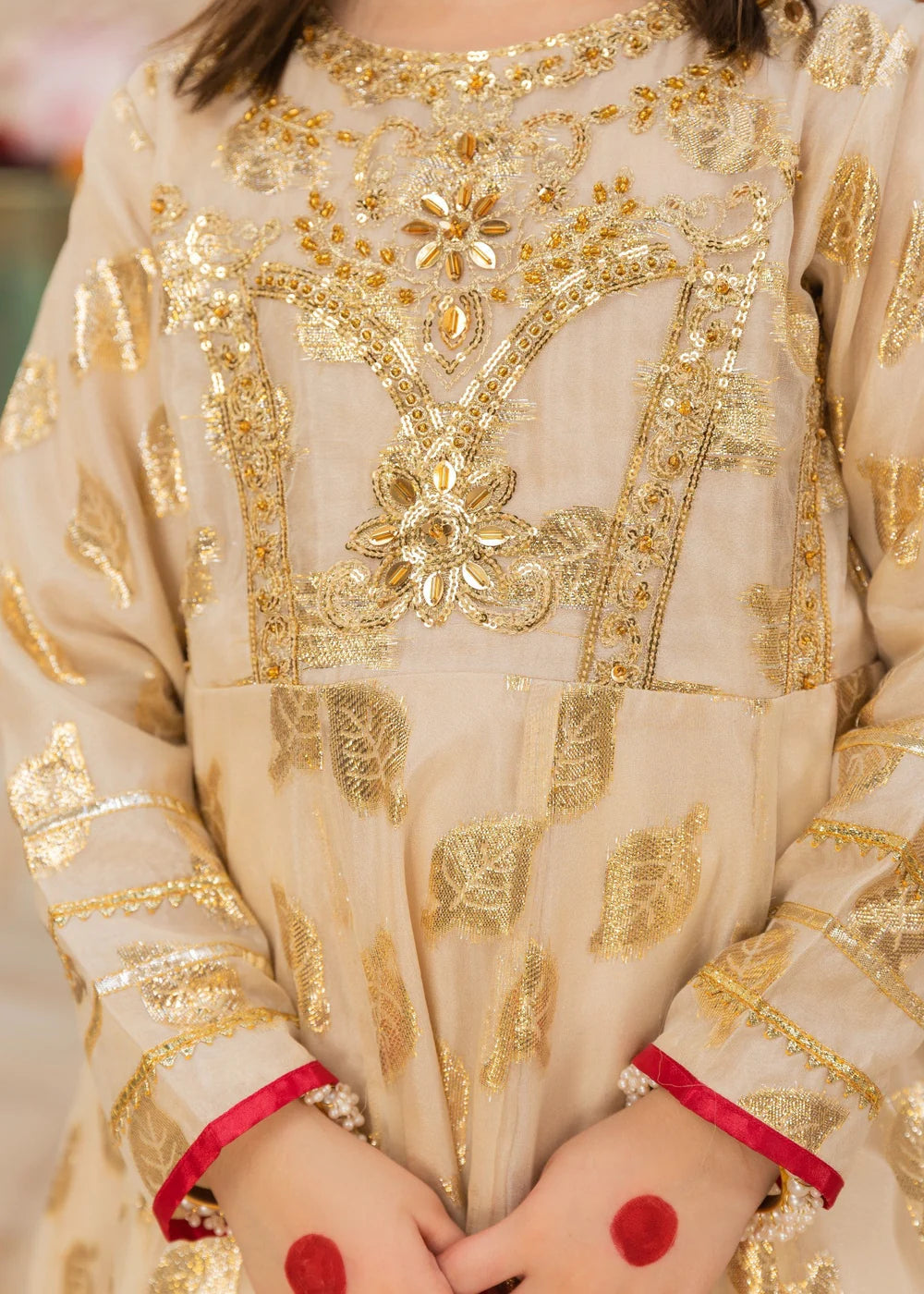A Zari organza pishwas featuring tilla and thread embroidery, beautifully enhanced with handwork of beads and sequins. Paired with a gold-printed organza dupatta, and stitched with grip lining and a cancan border, this outfit exudes elegance and festive charm