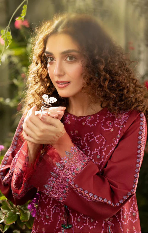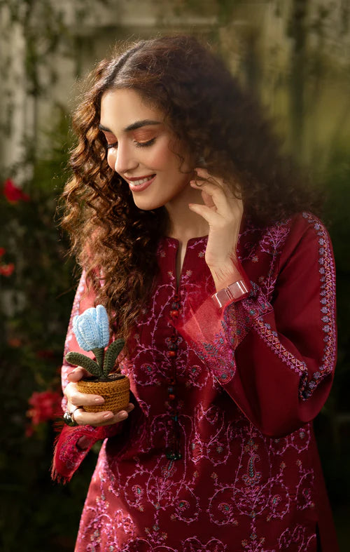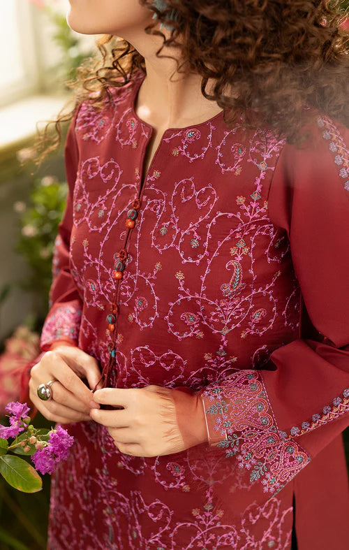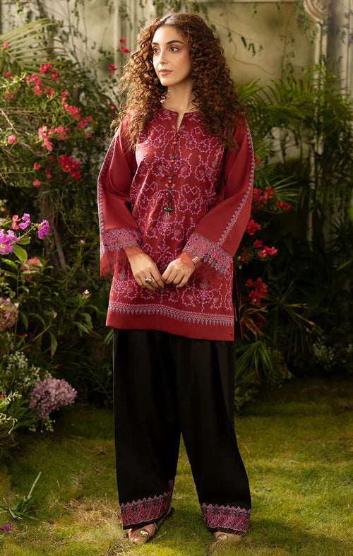 Description: Ruby Orchid, a stunning maroon kurta with intricate pink embroidery on the shirt, paired with a sleek black farshi shalwar. The shalwar features a matching embroidered border on the bottom, creating a beautifully coordinated and elegant set.