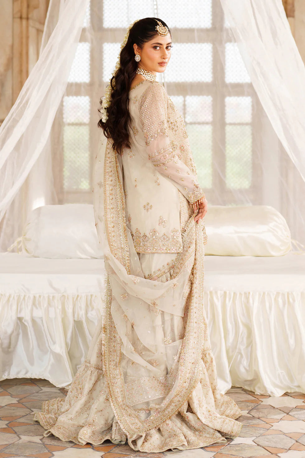 This exquisite ensemble is a true representation of timeless elegance and artisanal craftsmanship. The shirt is beautifully detailed with delicate embroidery, sequins, and adda work, adorned with an asymmetrical design that adds a contemporary edge. Its neckline features refined finishing with a keyhole detail, while the hem is accentuated with intricate borders and fine tasseling for a graceful movement. The organza dupatta is enriched with finely crafted borders on all sides, enhanced with a symmetrical spray that exudes sophistication. Complementing the look, the gharara is designed with layered accents, featuring delicate motifs, edgings, and embellished borders that create a regal flair. Every element of this ensemble speaks of luxury, making it perfect for festive and formal occasions.