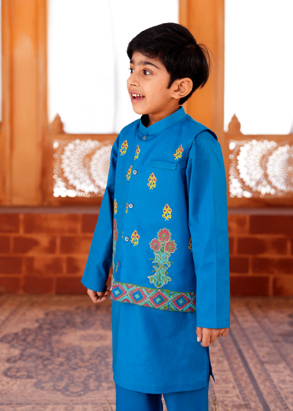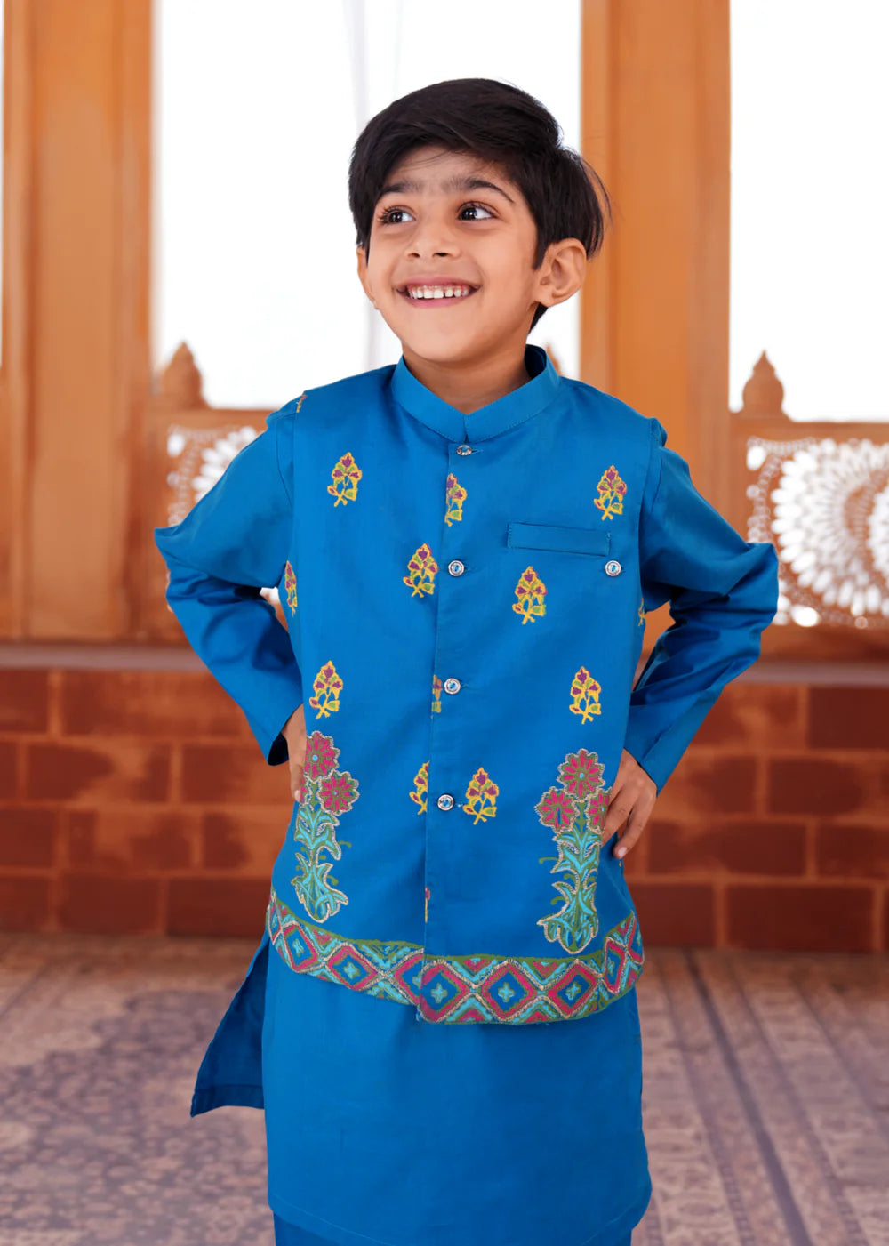 Royal Sapphire Blue Block printed Waistcoat, Kurta, and Trouser Set (3 PIECE) Kurta+Trouser+Waistcoat Let your little one stand out in this Sapphire Blue Cotton ensemble, featuring a beautifully block-printed waistcoat, kurta, and trouser. The decent floral and geometric patterns add a vibrant touch, making it a perfect blend of tradition and elegance. Designed for comfort and style, this outfit is a must-have for festive celebrations, weddings, and special occasions. A timeless classic with a regal charm! Disclaimer: Actual product color may vary slightly from the image.