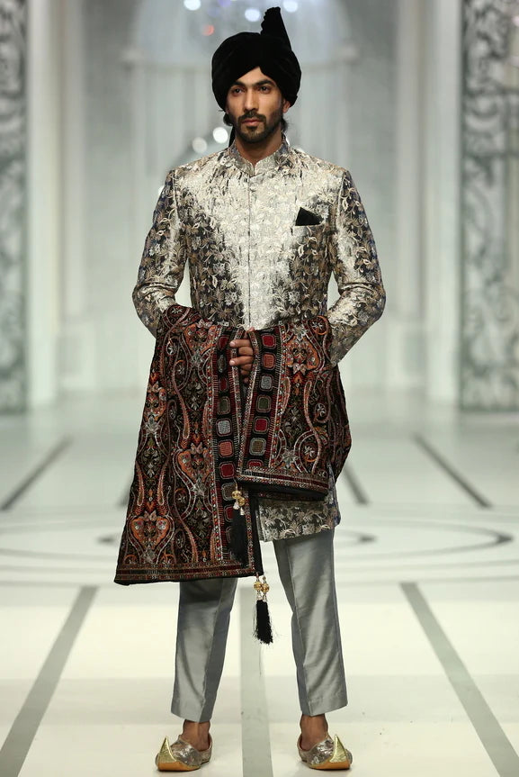 This off-white jamawar sherwani features intricate hand embroidery on the neck and cuffs, offering a look of timeless elegance. Paired with a black velvet shawl, this ensemble provides a royal look for any grand occasion.