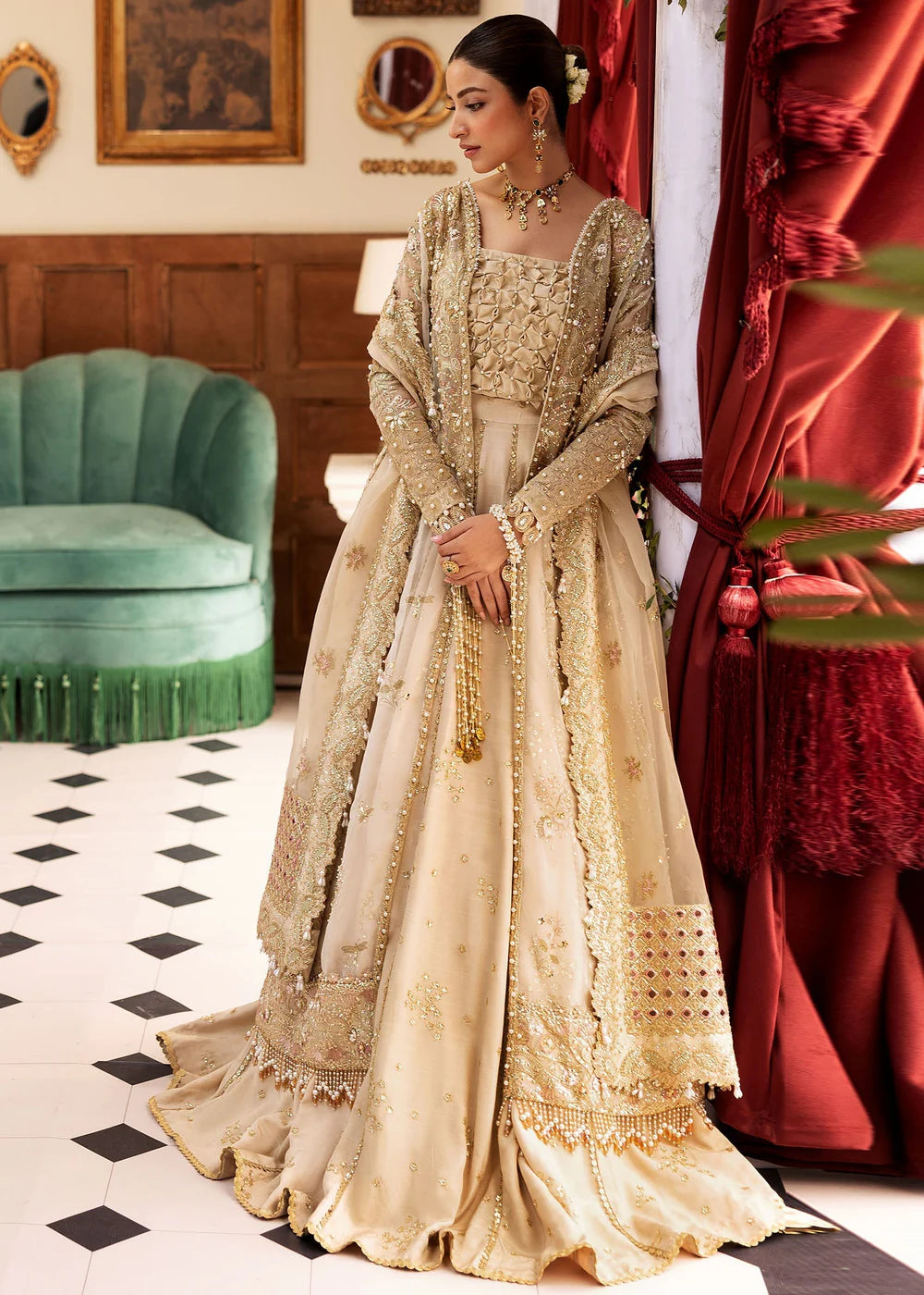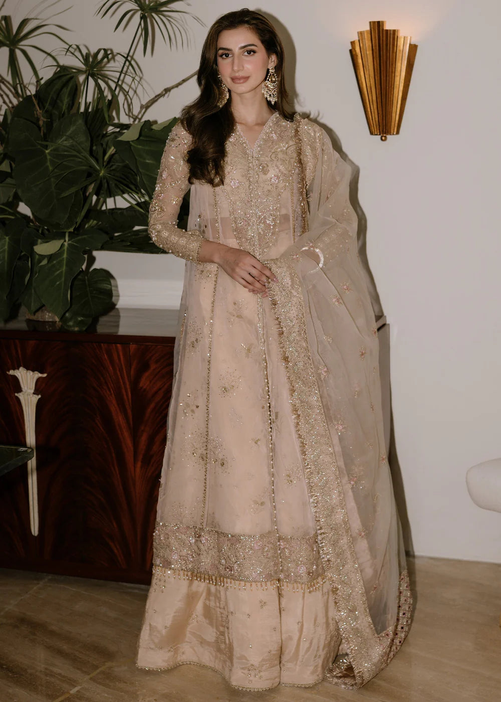 Product Description: Purity and perfection come together in this floral based design that features a digitally printed organza gown with 3d crafting used to lift the base pattern. Offset with heavily crafted sleeves, a gorgeous neckline and border all detailed with hand embellishments design whispers everything soft , feminine and romantic. Paired with a detailed dupatta and a soft silk sparkling lehnga.