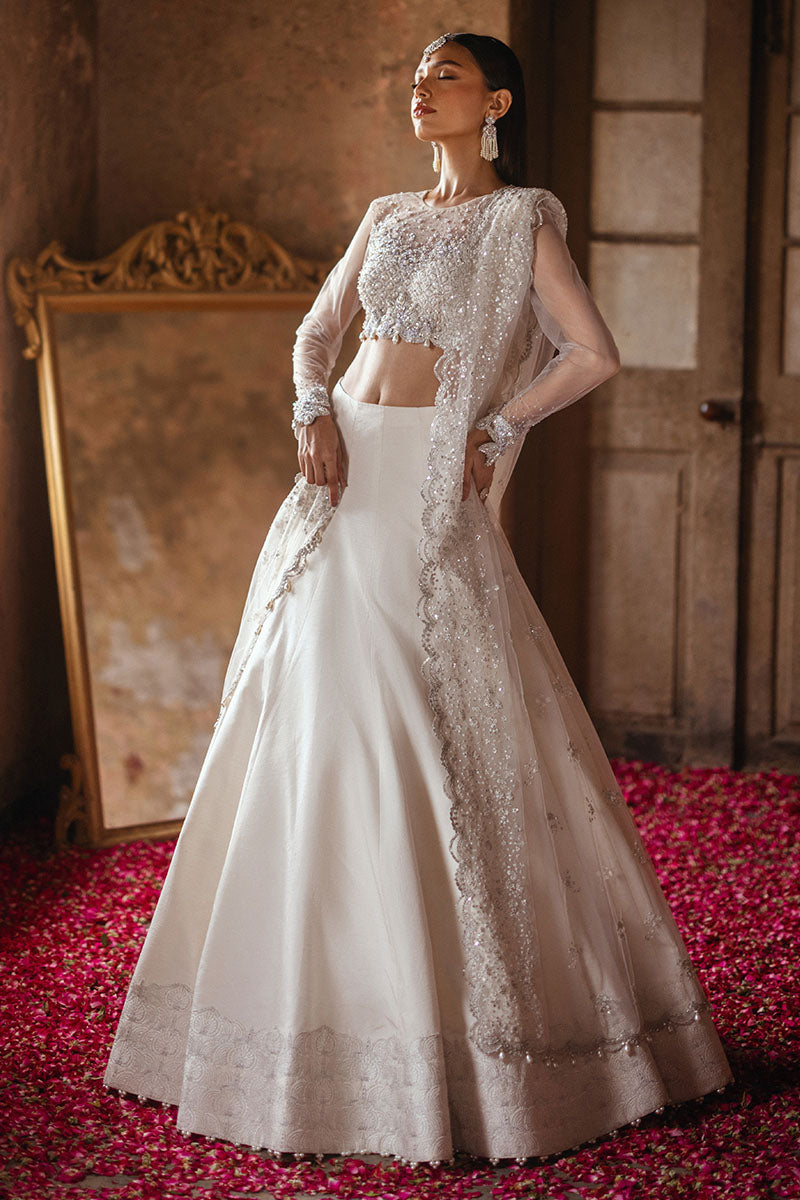 Introducing an exquisite ensemble that seamlessly blends traditional elegance with contemporary flair. This stunning outfit features a dupatta crafted from three yards of embroidered, blingy net fabric, adorned with intricate beadwork and sequins. The dupatta is paired with a heavily embellished net blouse, showcasing a masterful fusion of seroscies, pearls, and sequins, meticulously woven using advanced handwork techniques. Completing this opulent look is a Korean silk lehenga, known for its graceful flow and adorned with rich, ornate borders, adding a touch of regal sophistication. This ensemble captures a perfect harmony of classic charm and modern design.