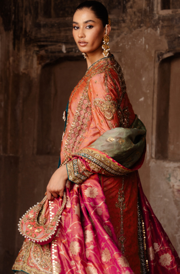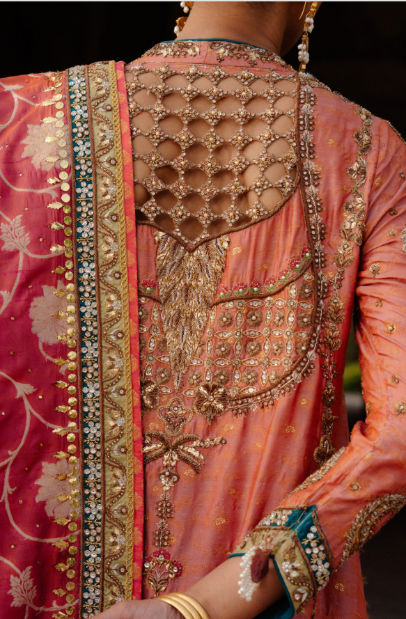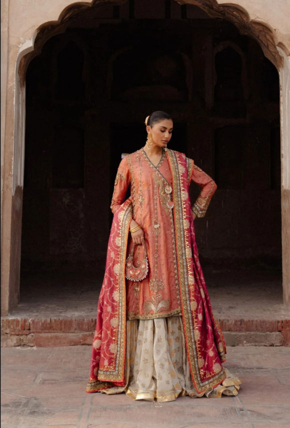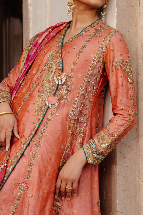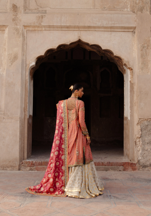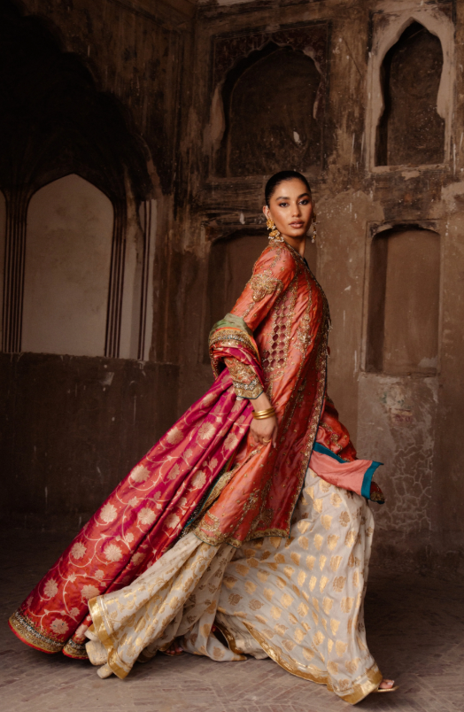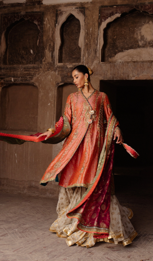 This stunning ensemble features a chogha-style kalidaar, richly adorned with patchwork, kali detailed work, and classic ambi embroidery that draws inspiration from traditional artistry. It’s paired with a luxurious banarsi double-sided dupatta boasting detailed borders, adding a regal touch to the outfit. The ensemble is completed with a striking white printed and jamwar dhaka sharara, finished with gota edgings that lend a festive sparkle. Nimar is a harmonious blend of cultural heritage and modern elegance, perfect for wedding celebrations and formal occasions.