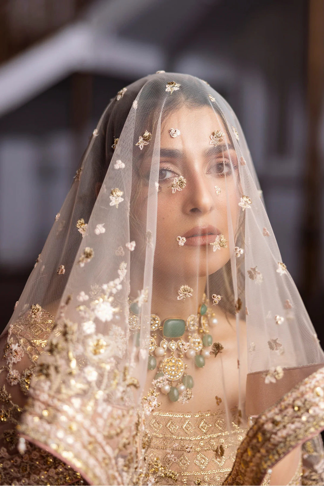 The outfit is a beautiful peach-colored pishwas, paired with a matching blouse and a net dupatta. The pishwas is intricately embroidered with a mix of floral patterns, adding a touch of elegance and sophistication. The tissue fabric used for the Pishwas and Lehnga gives the outfit a luxurious feel, while the net dupatta adds a delicate and airy texture.
