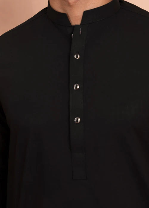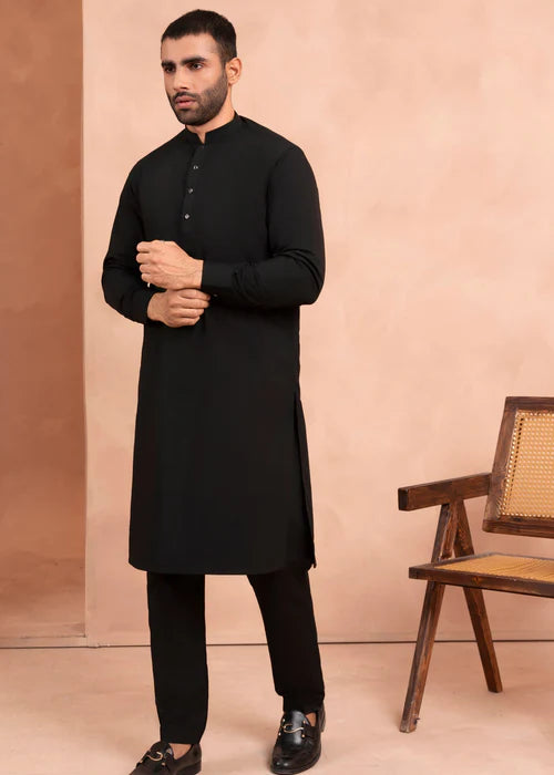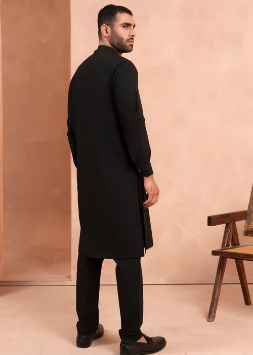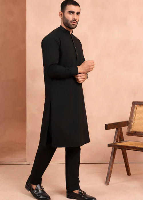 Additional Description: Make A Statement With The Raven Black Mandarin Collar Shalwar Kameez, Tailored For A Sleek Silhouette And Adorned With Subtle Stitching. Perfectly Blends Tradition With Contemporary Style. Package Includes: Kurta Trouser Fabric: 4 Meters Blended Fabric Product Category: Eastern Festive Wear Season: All Season Features: Mandarain Collar Full Sleeves