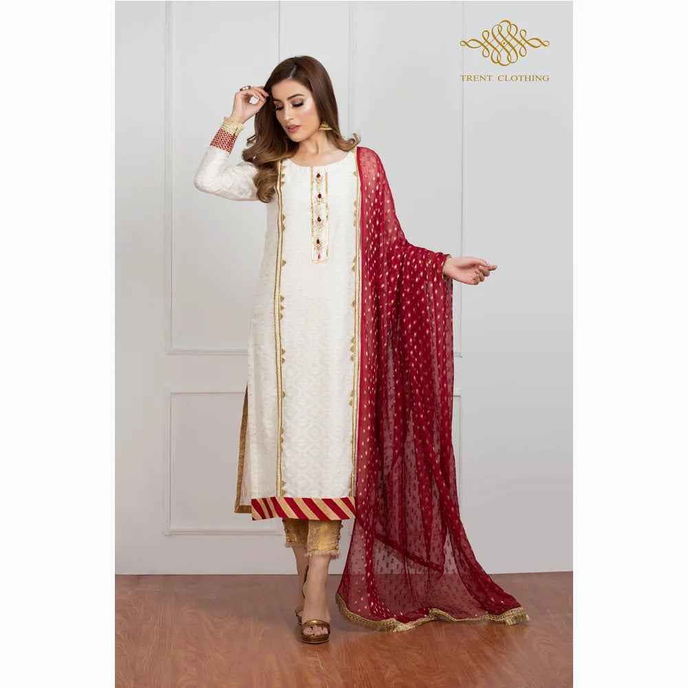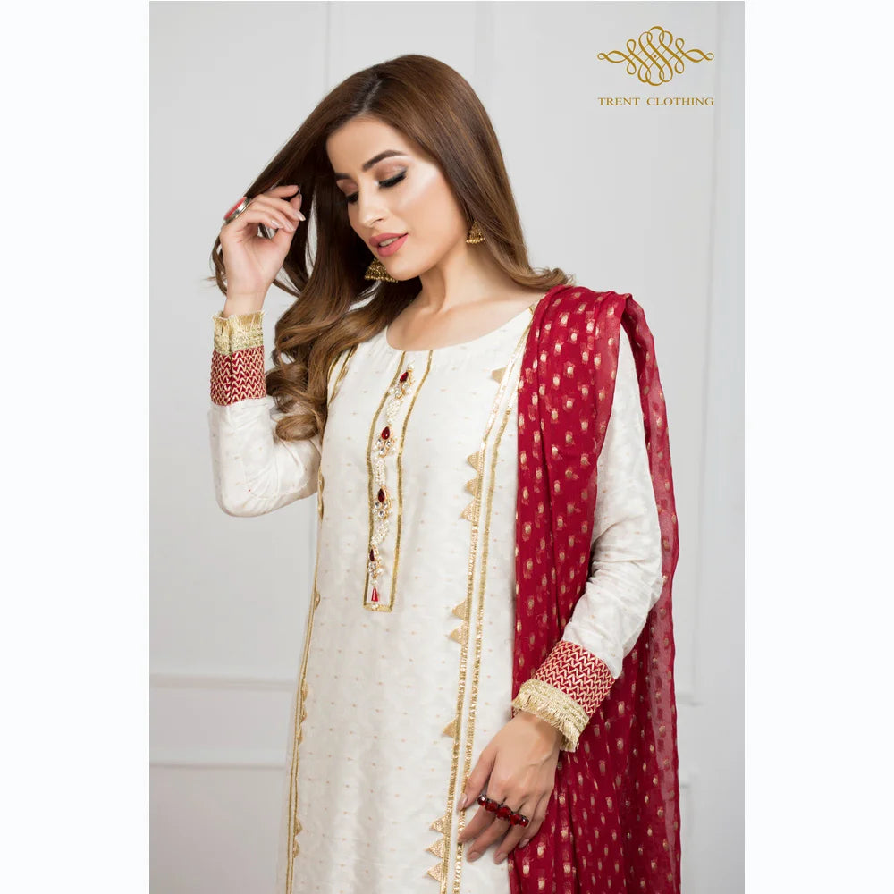 Shadow white sets a new tone to celebration , the epitome of grace and charm . A white cotton net straight shirt decorated in hues of gold and red in the most understated yet beautiful manner paired with fitted gold jamawar pants and red zari dupatta.