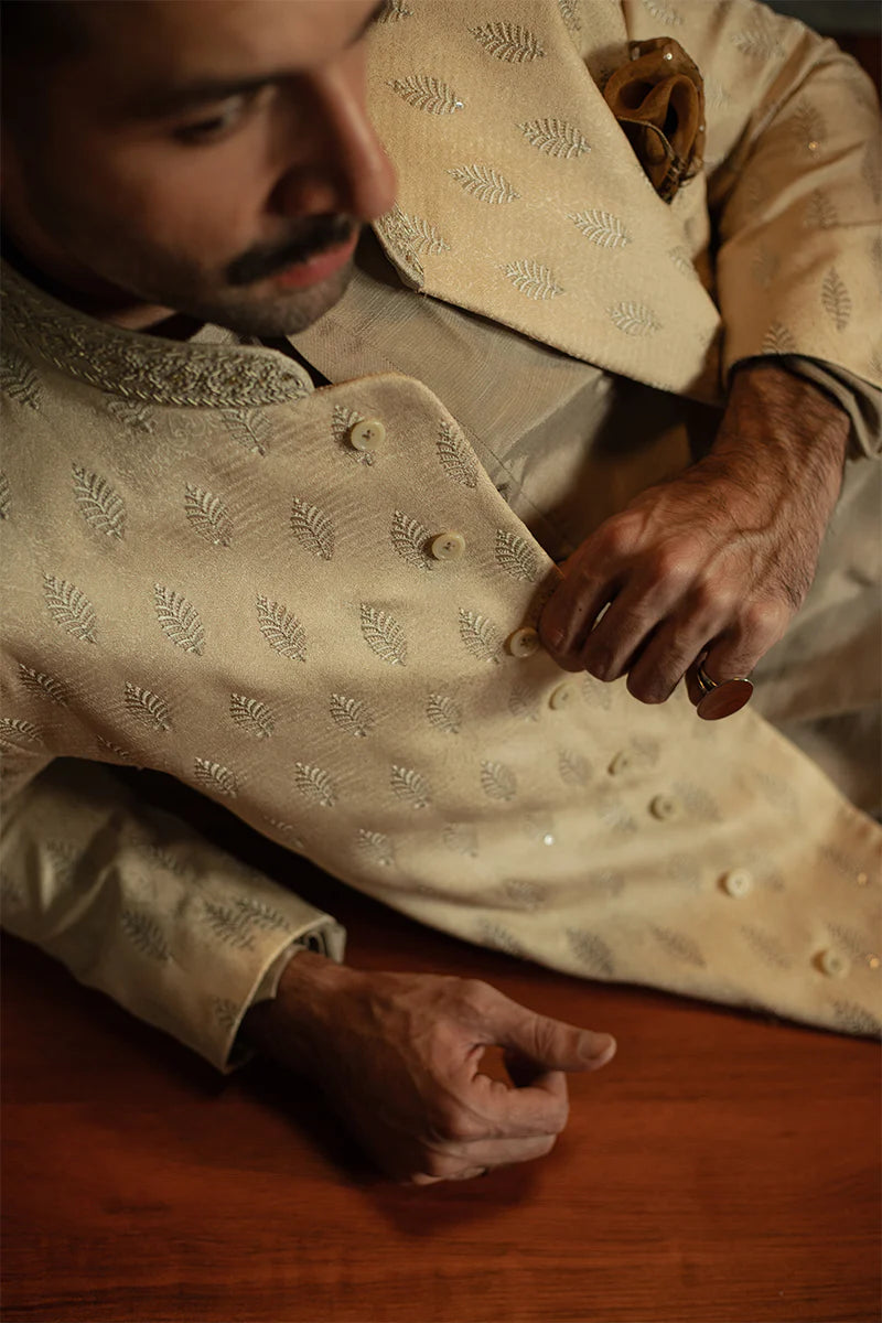 A light beige sherwani detailed with contemporary leaf motifs adorned with sequins and hand embellished band collar.