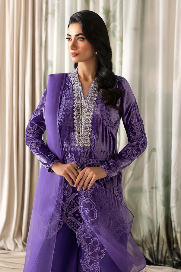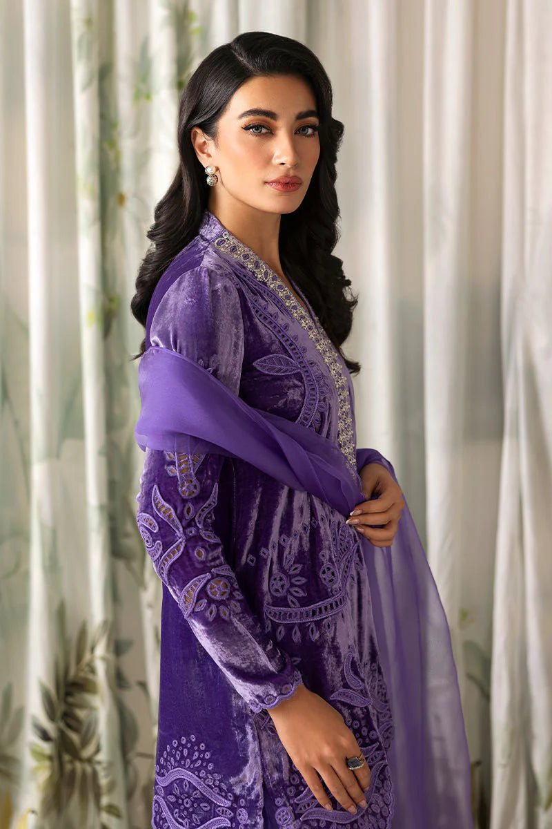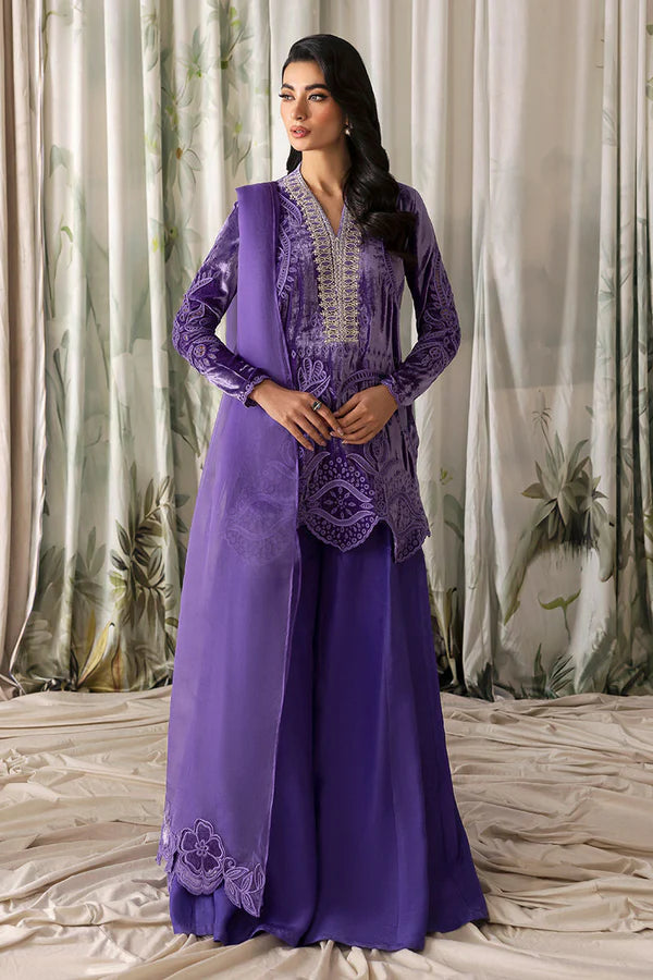 Stand apart the embroided cutwork and neck hand embellished pure lilac velvet to comfort and flatter for years to come. It is paired with sharara pants and organza dupatta with beautiful dori and appliqe work on pallu.