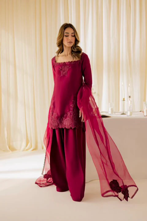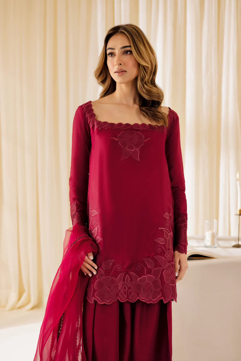 What dreams are made of! Introducing the most awaited, much loved “The Tara Set” from our Eid Edit’25. With the most flattering neckline, dreamiest shade of reddish maroon, and the hottest cut of season, our fully embroidered “The Tara Set” is definitely Eid Pret at its finest.