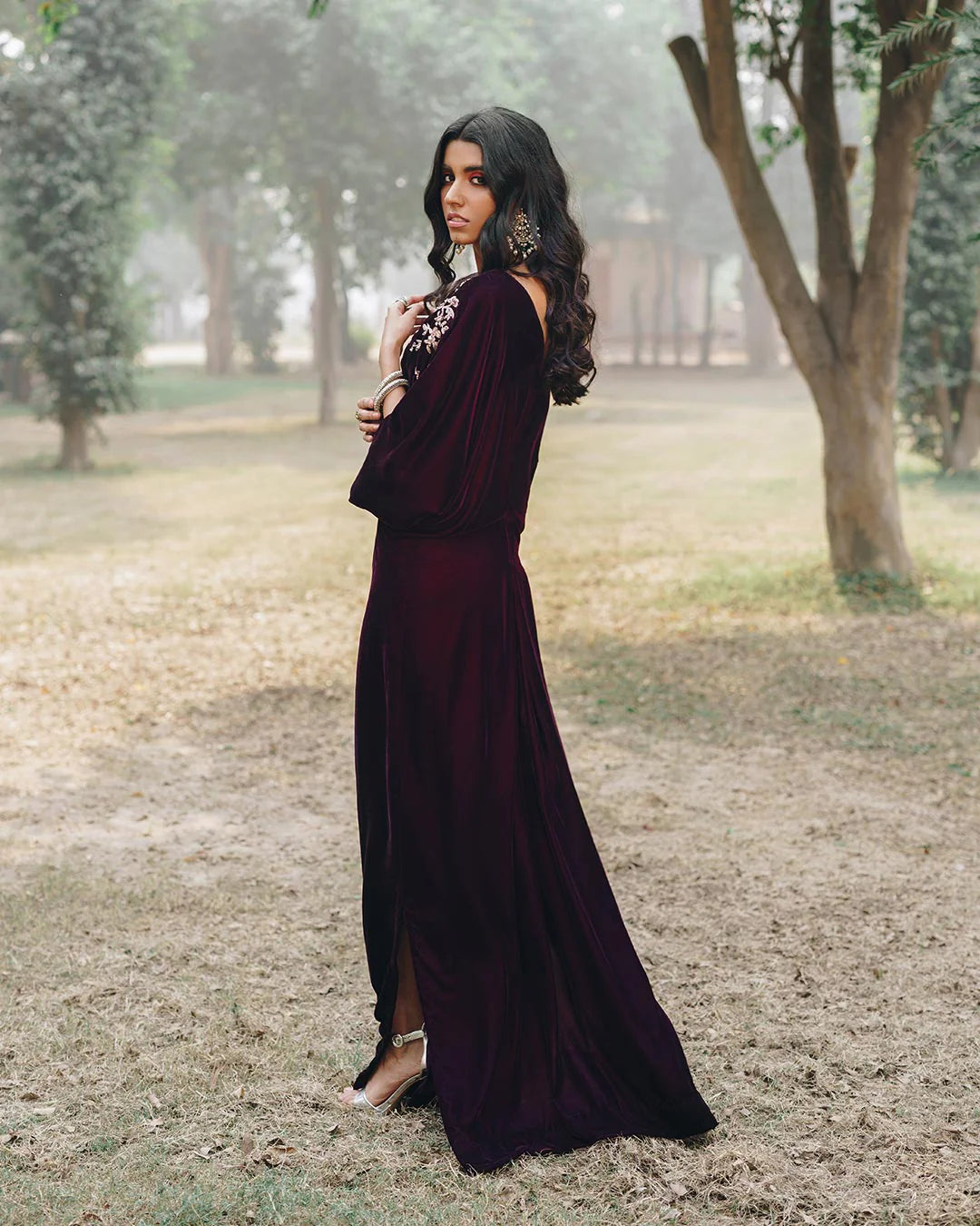 Description:An elegant kaftan silhouette featuring embroidered floral trellises coming down from the shoulders. This chic silhouette is a must have for your winter wardrobe.