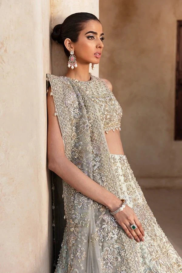 This heavenly attire from the Sarang Bridals and Formal Collection is sure to make you feel like the belle of the ball. The delicate net fabric in a stunning light green hue flows elegantly down to the floor, while the beautifully paved embroidery of lilac 3D flowers adds a pop of blush and texture. It's paired with a matching blouse, adorned with the same breathtaking embroidery and jeweled work catching the light beautifully, making you shine like a star.