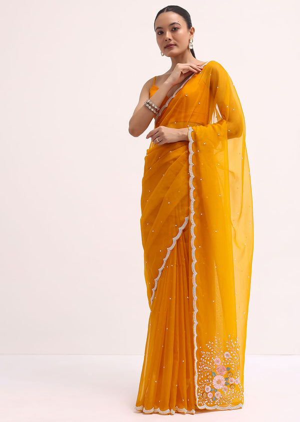 Dive into luxury with our stunning yellow saree, meticulously crafted to capture the essence of festive elegance. Fashioned from indulgent organza fabric and embellished with detailed 3D sequined floral embroidery and a cutdana scallop border, this ensemble radiates sophistication and opulence. Complemented by an unstitched blouse. Awarded as the Most Trusted Brand, we're delivering styles you love, just as promised.