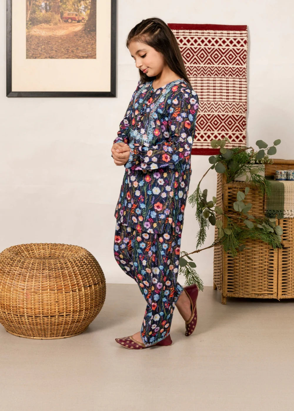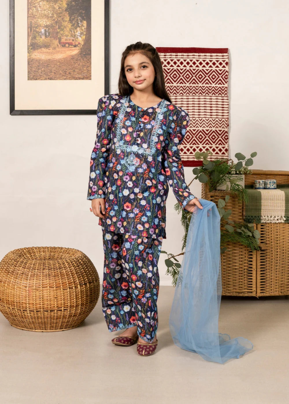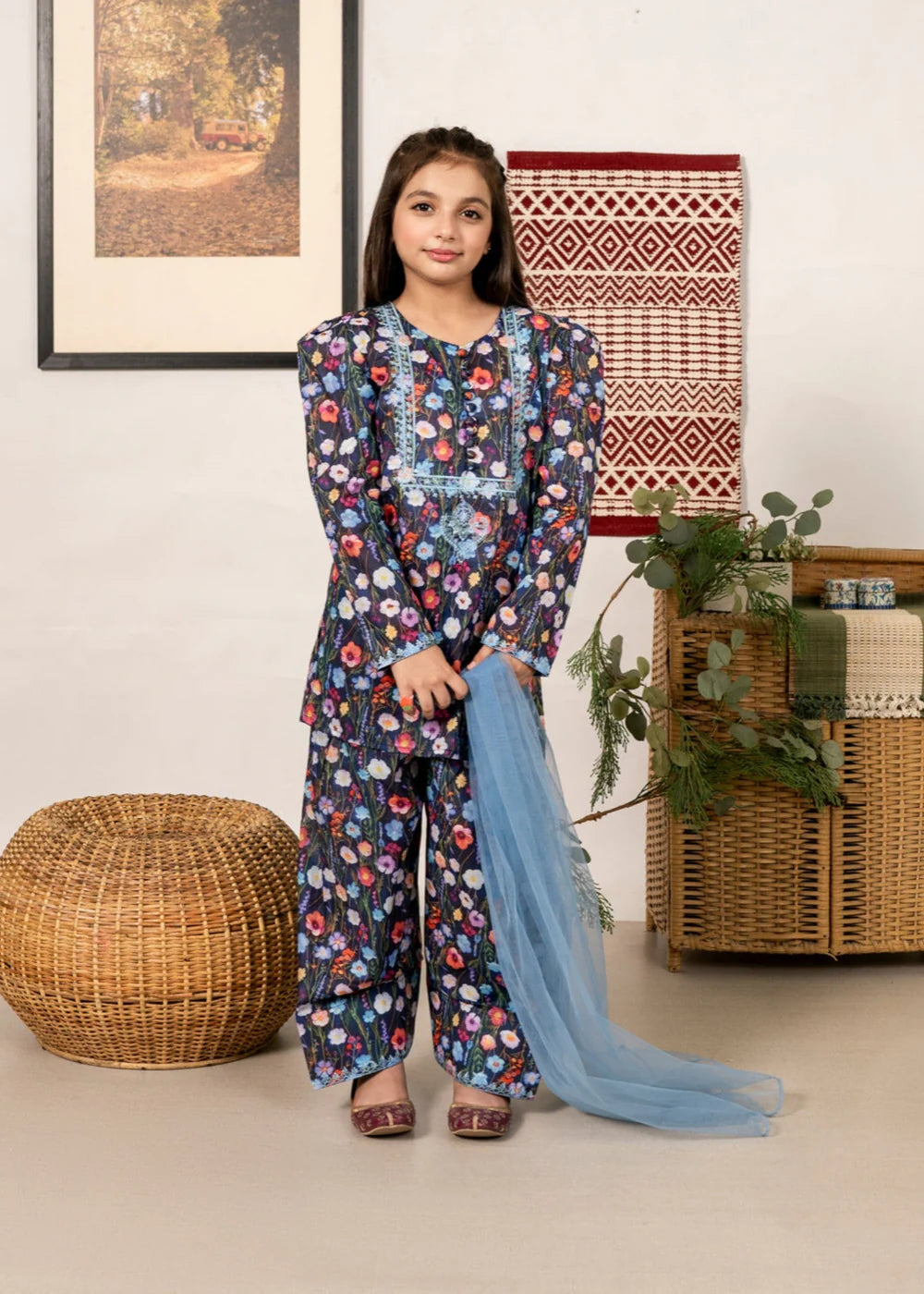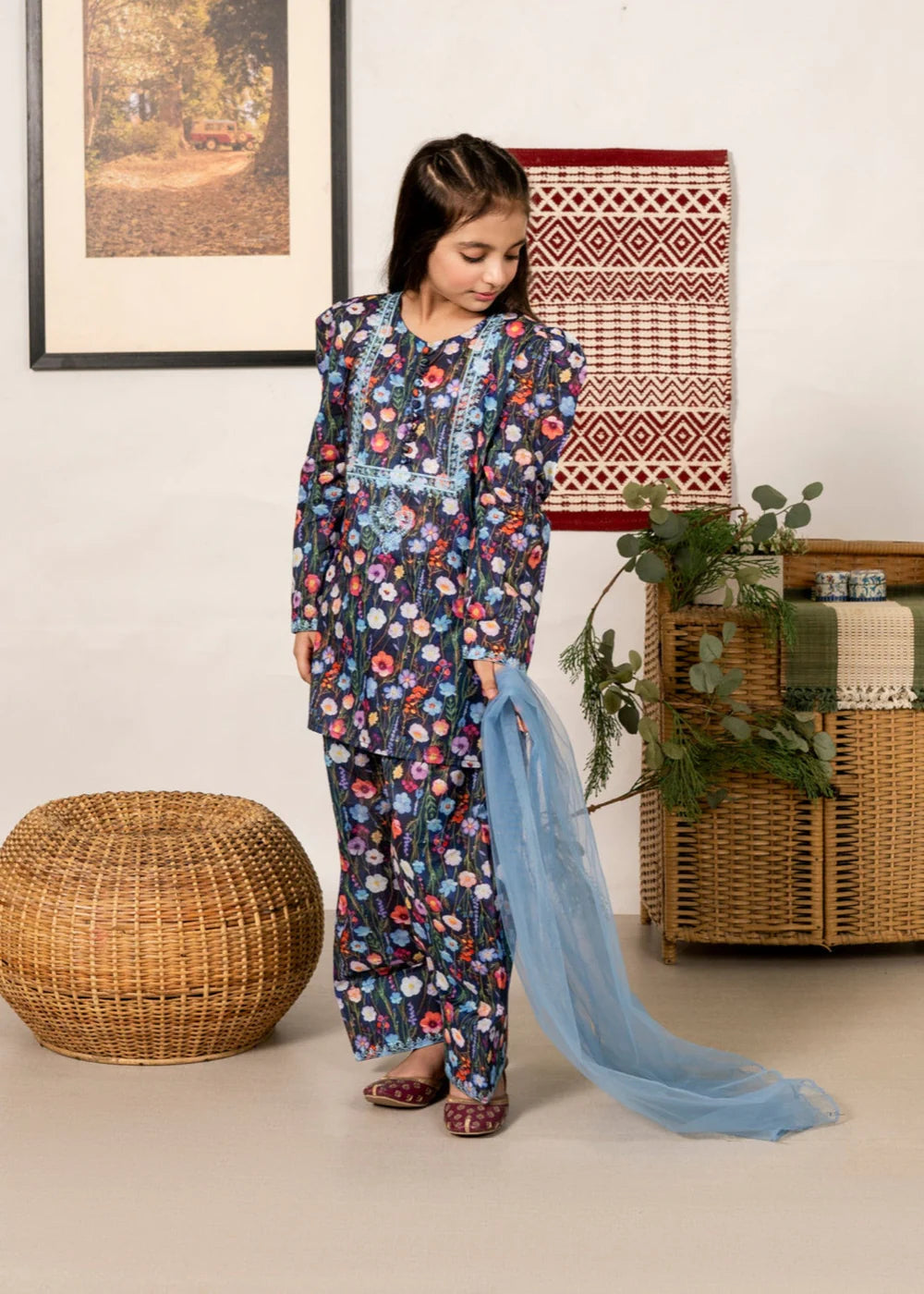 This exquisite Girl's Summer Wear Kurta Set by Al Qaswa Kids is the perfect addition to your little one's wardrobe. Crafted from soft lawn fabrics, the short kurta features beautiful blue color with intricate embroidered detailing. The loose-fit top pairs elegantly with a shalwar and net dupatta for a complete look. Ideal for daily/basic wear.