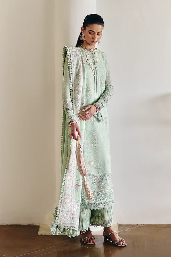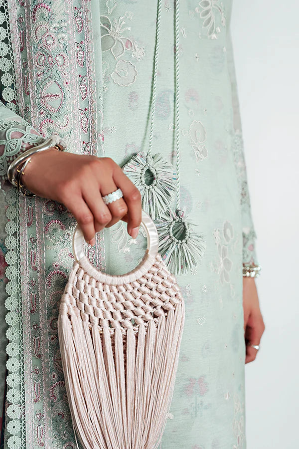 - The pants are crush-style and made in the same mint green color, showcasing Suzani patterns along with splatters of lace.