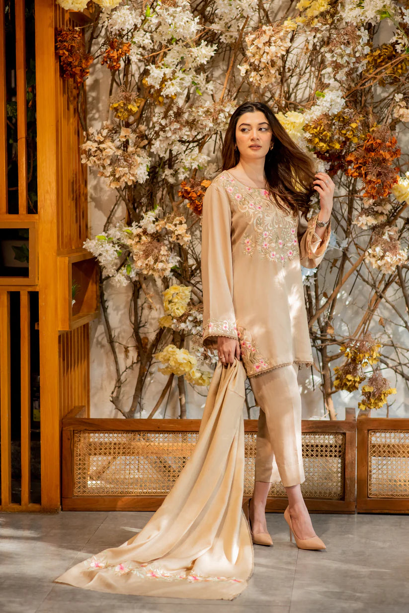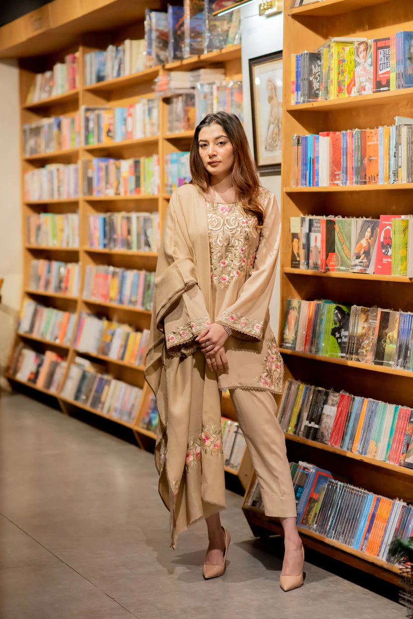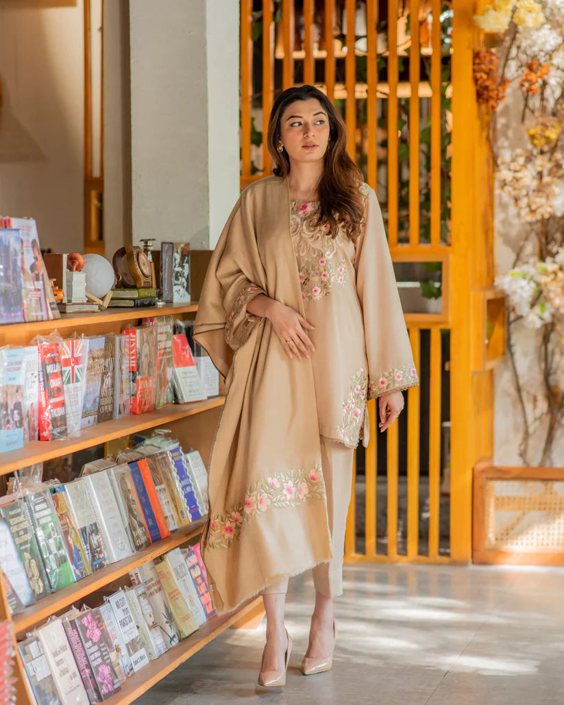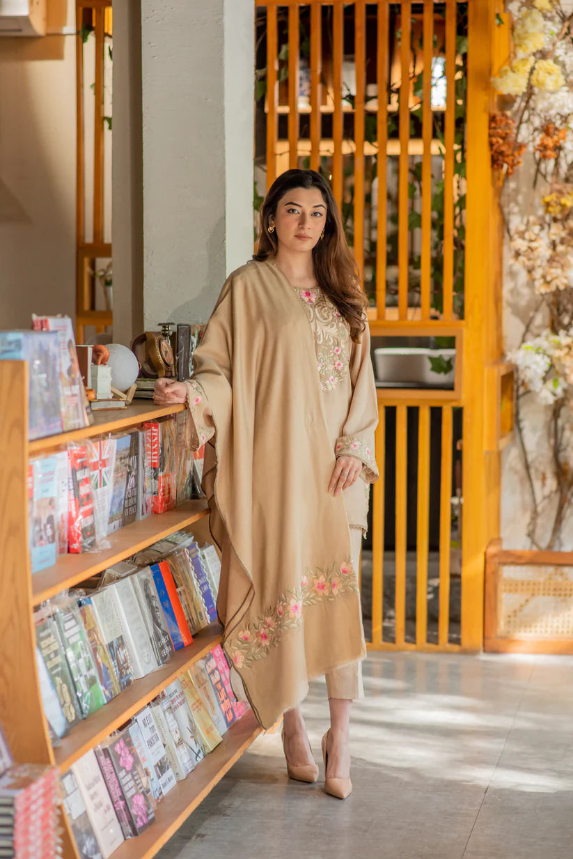 Stitched suit on pure karandi with pure woollen shawl (fully embroidered suit and shawl).
