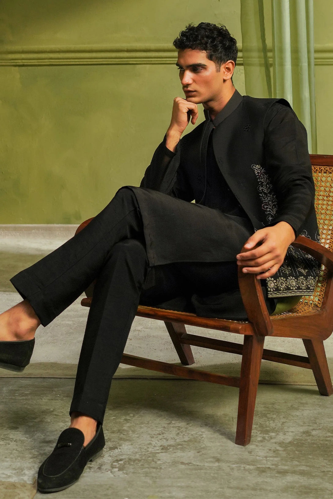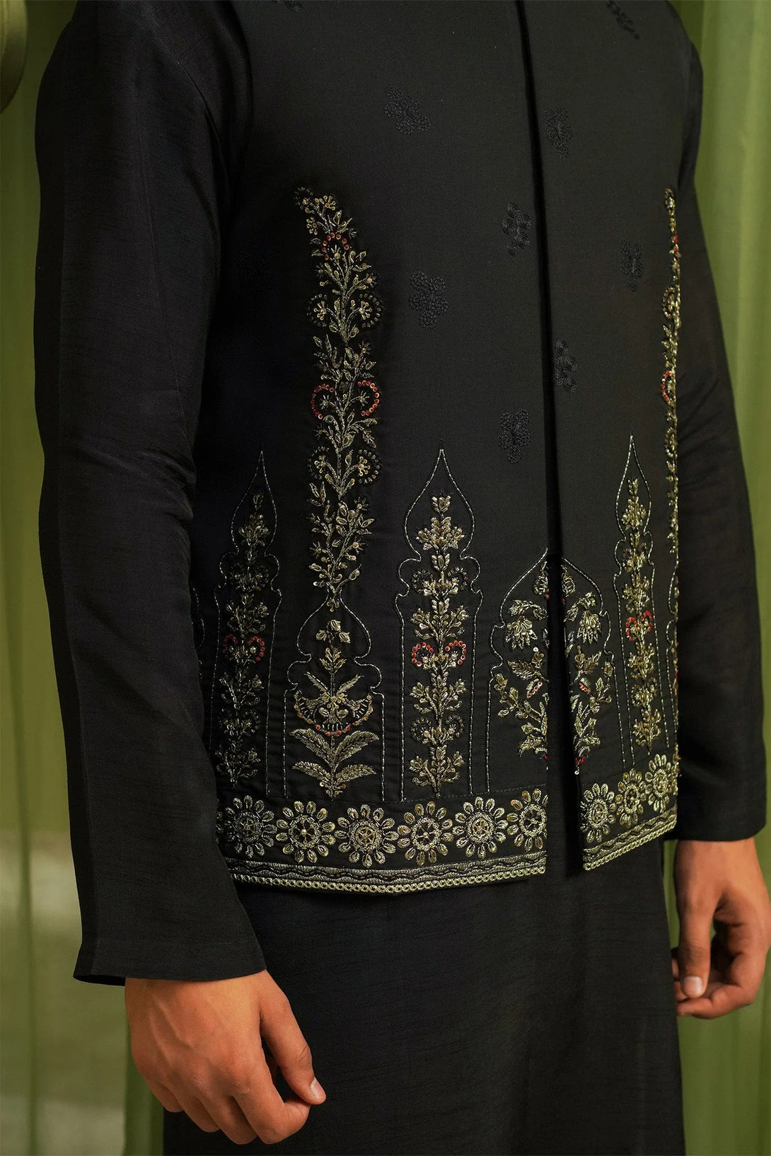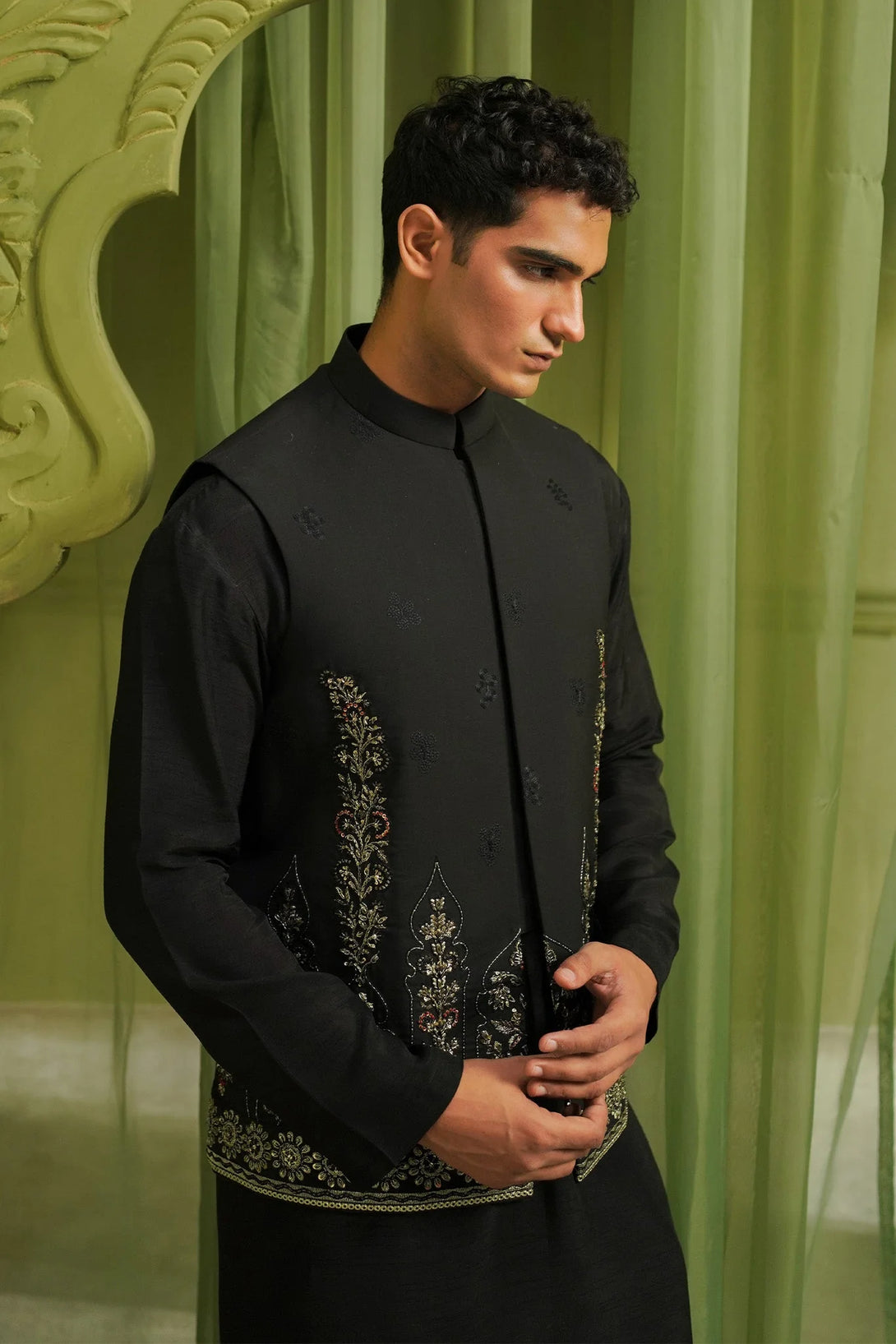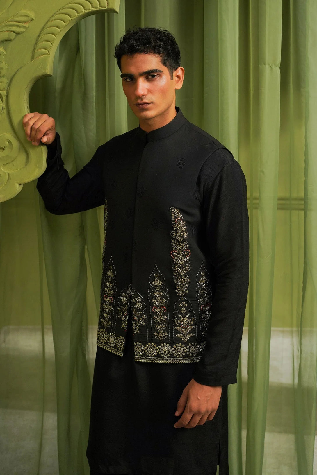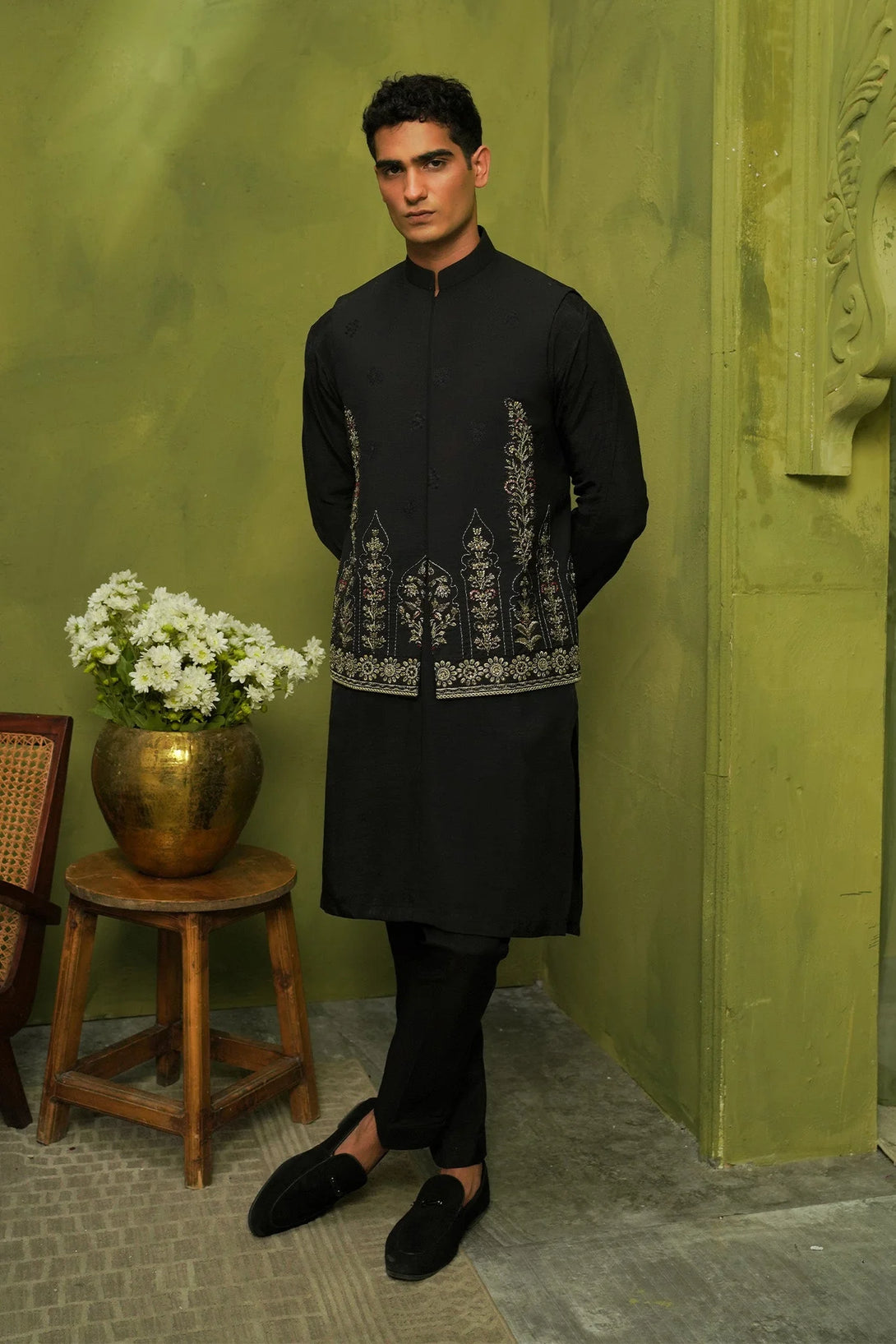 Unveiling this exquisite black vase coat featuring intricate resham and zardozi handwork, perfectly paired with plain black raw silk pants and a kurta. A timeless ensemble that combines tradition with elegance. Ideal for making a sophisticated statement.