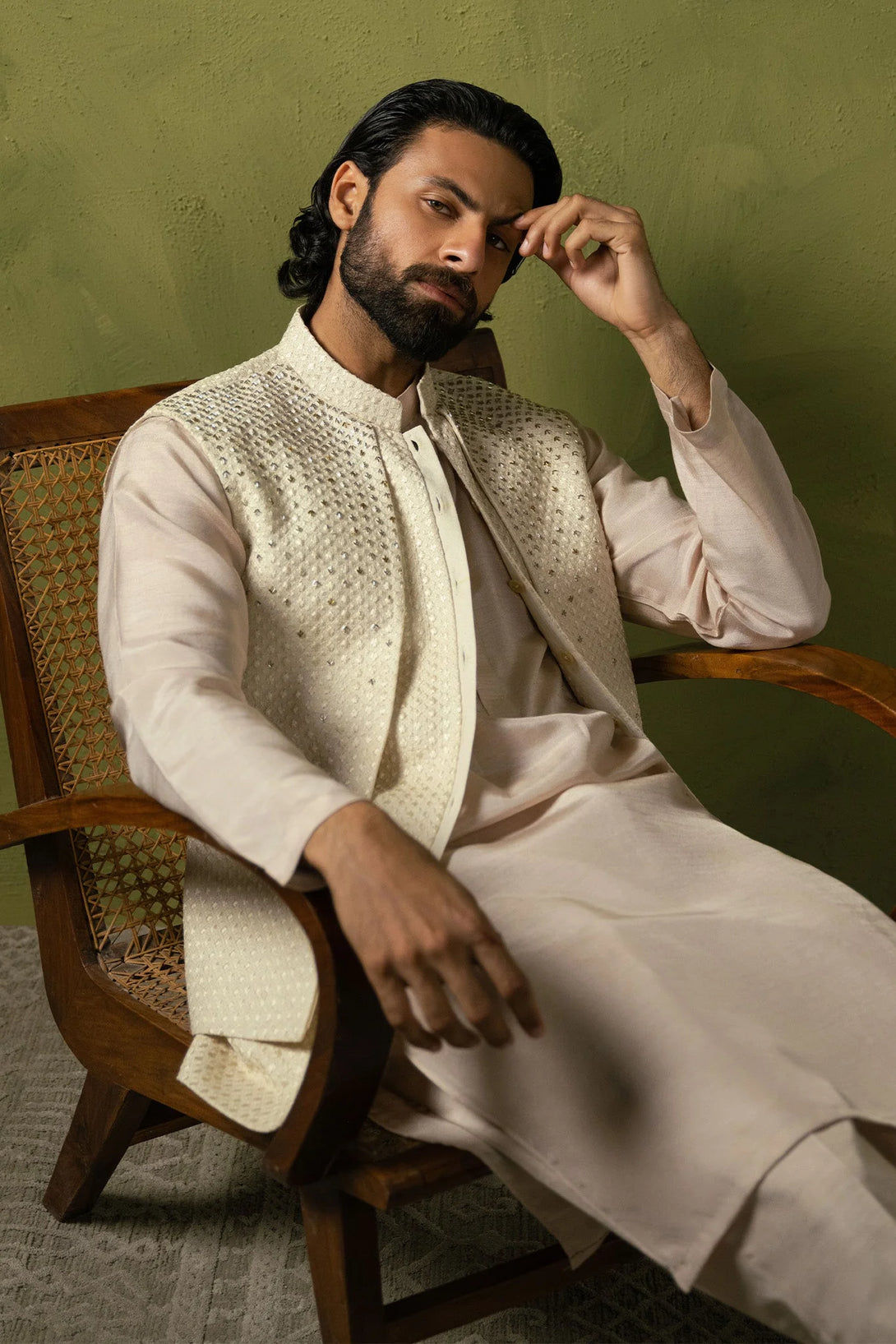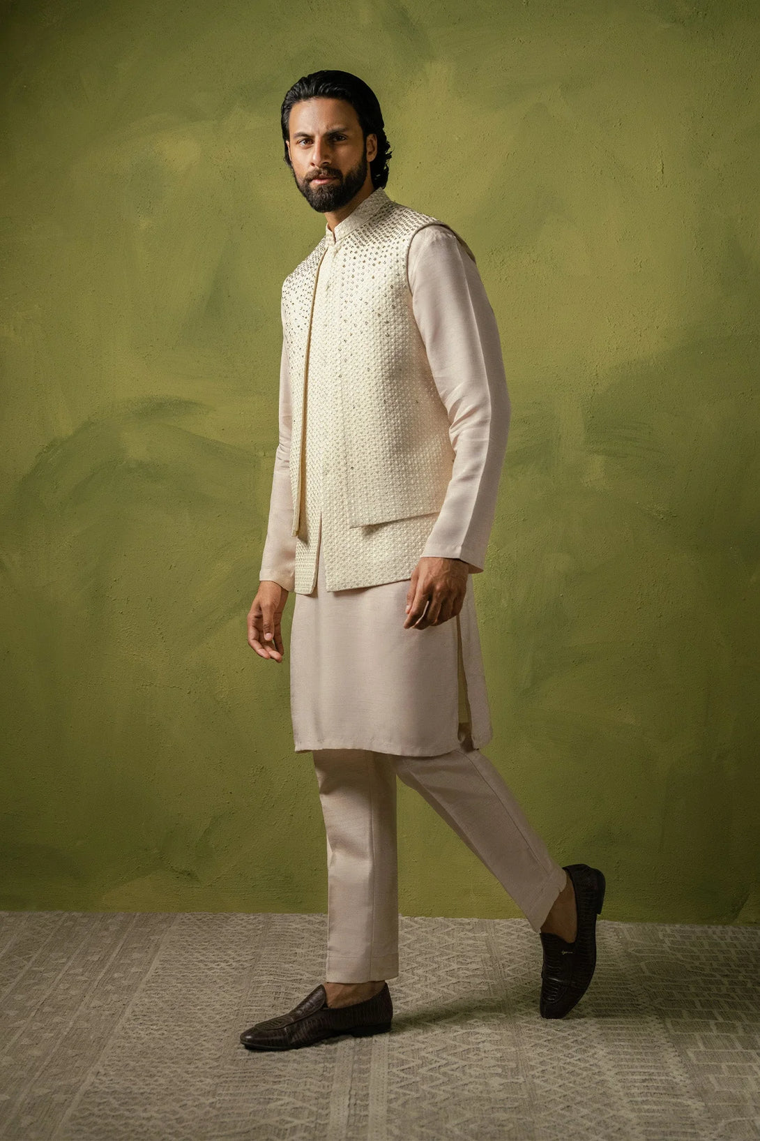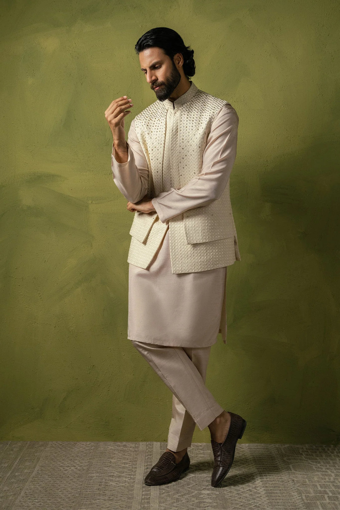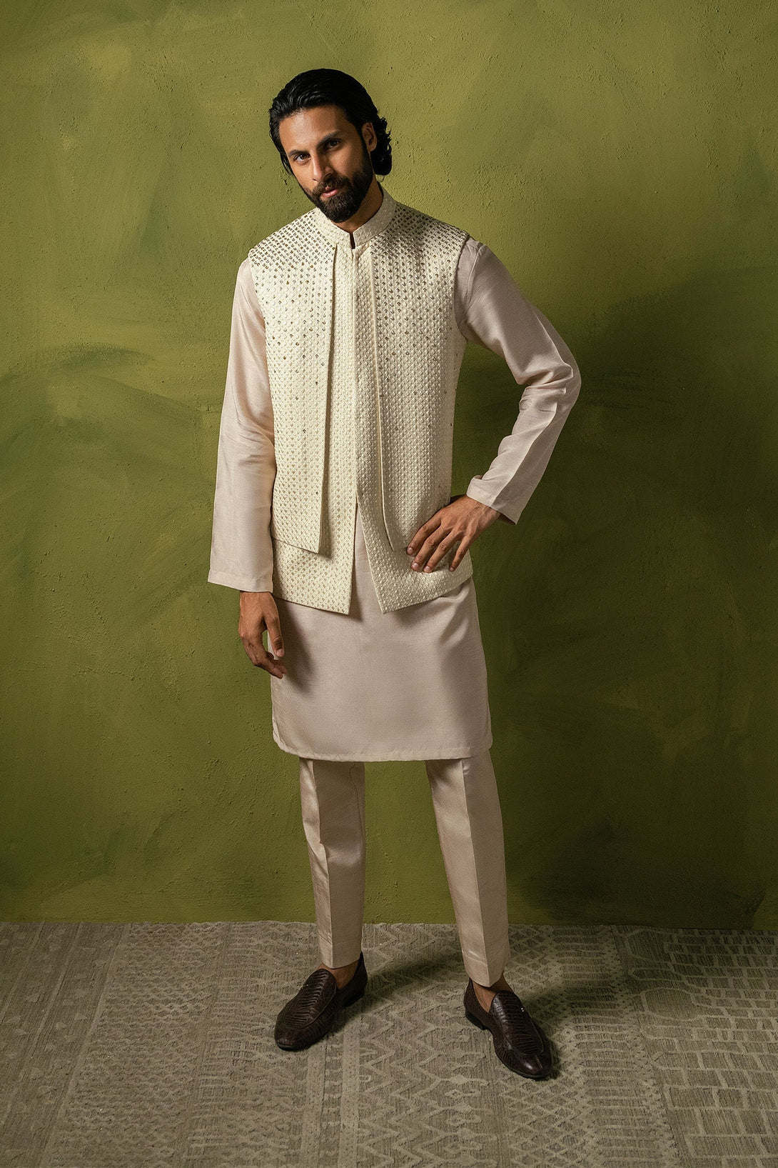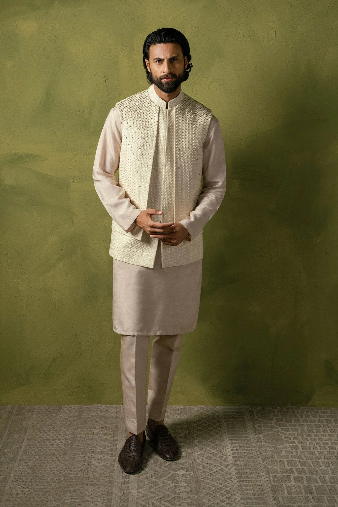 Unveiling this exquisite beige double style waistcoat featuring intricate resham and katdana work, perfectly paired with plain raw silk pants and a kurta. A timeless ensemble that combines tradition with elegance. Ideal for making a sophisticated statement.
