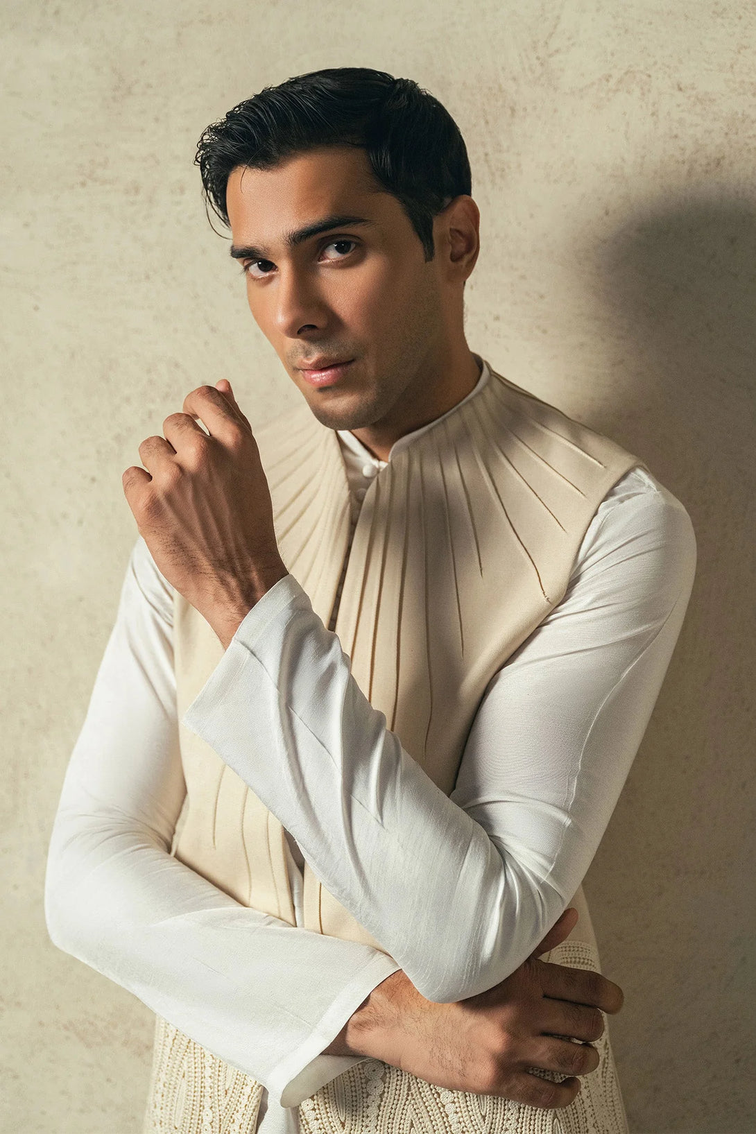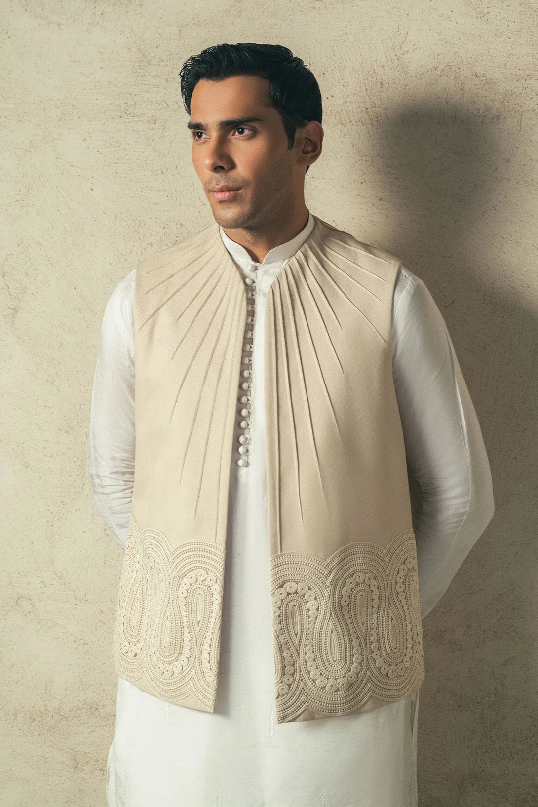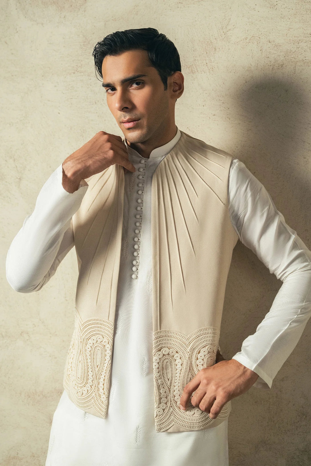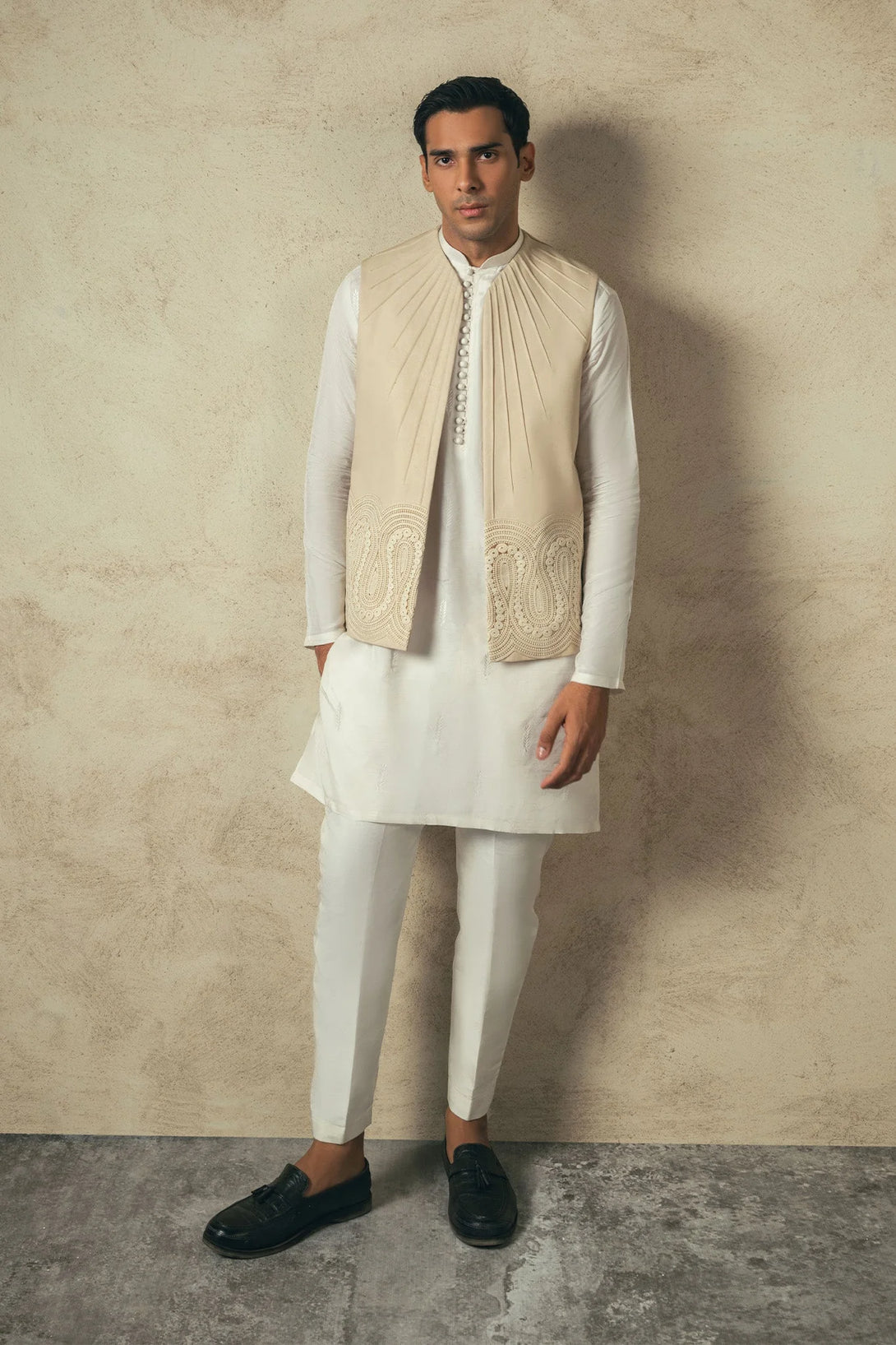 Introducing our beige contemporary style waistcoat, paired with an intricately embroidered white kurta and straight pants. Perfect blend of tradition and modern chic.