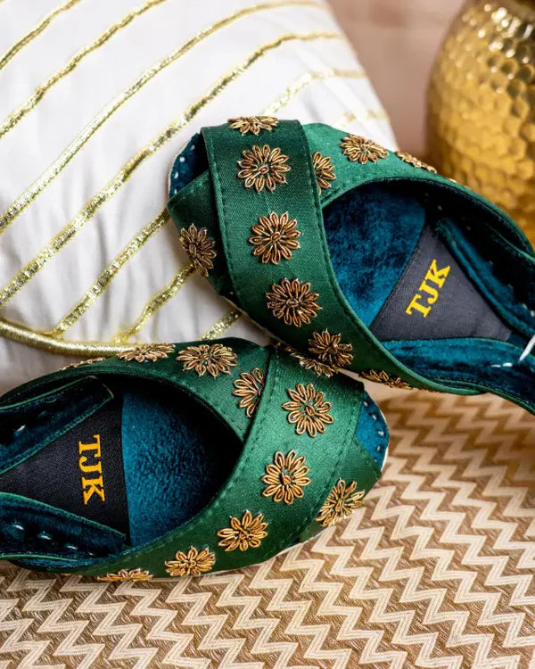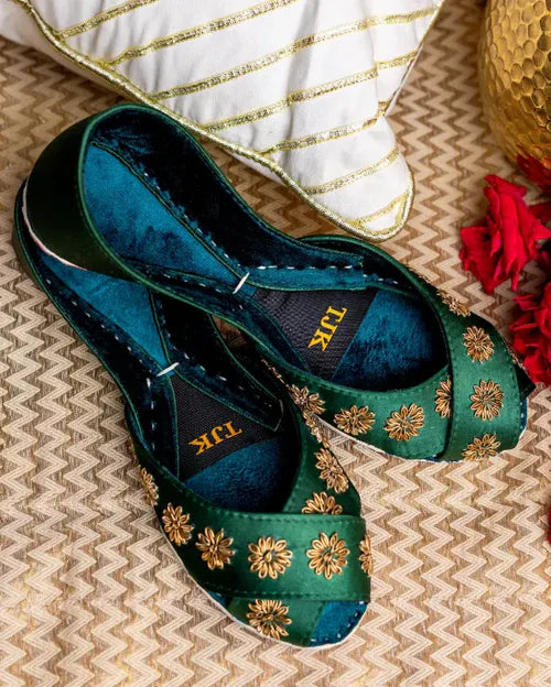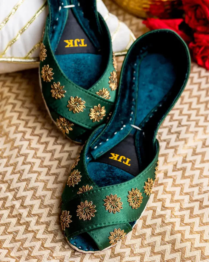 Luxurious emerald green khussas featuring meticulously crafted gold floral embroidery using traditional zari and dabka techniques, ideal for Mehndi & Shaadi occasions !