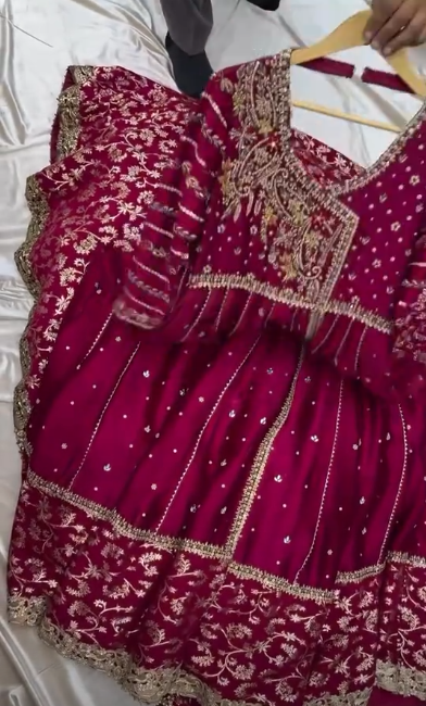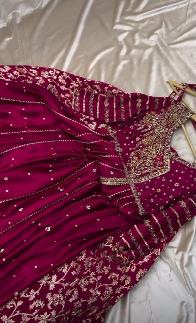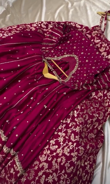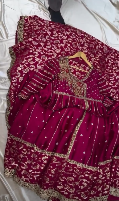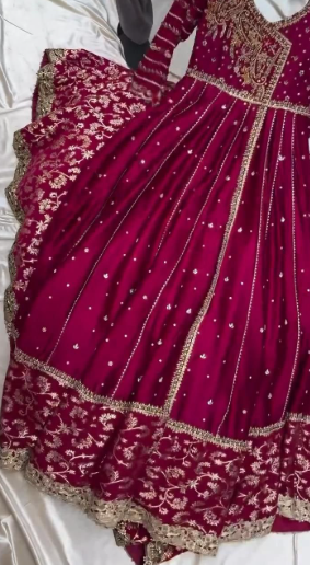 This stunning deep maroon ensemble is crafted in luxurious silk, giving it a rich, royal appeal perfect for winter weddings. The dress features a classic Angrakha silhouette with a beautifully flared hem, adorned with intricate golden zari embroidery and delicate embellishments scattered throughout the panels. The heavily embroidered border adds a grand, traditional touch, while the embellished neckline brings in a hint of regal charm.