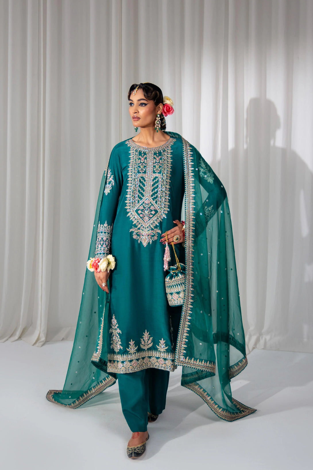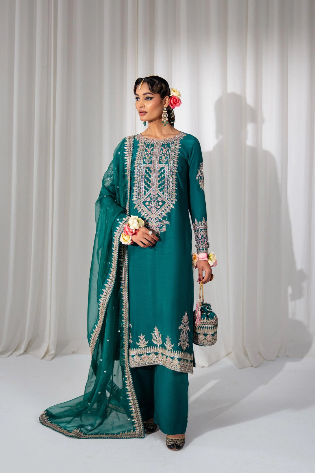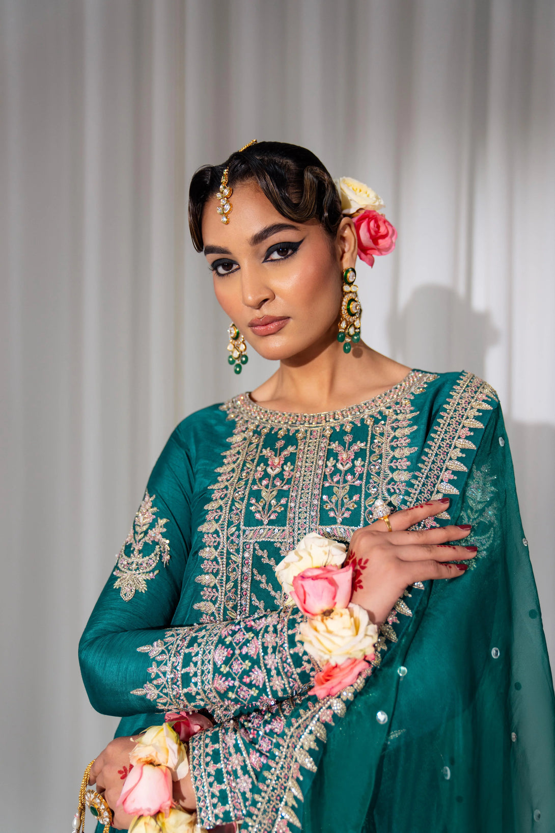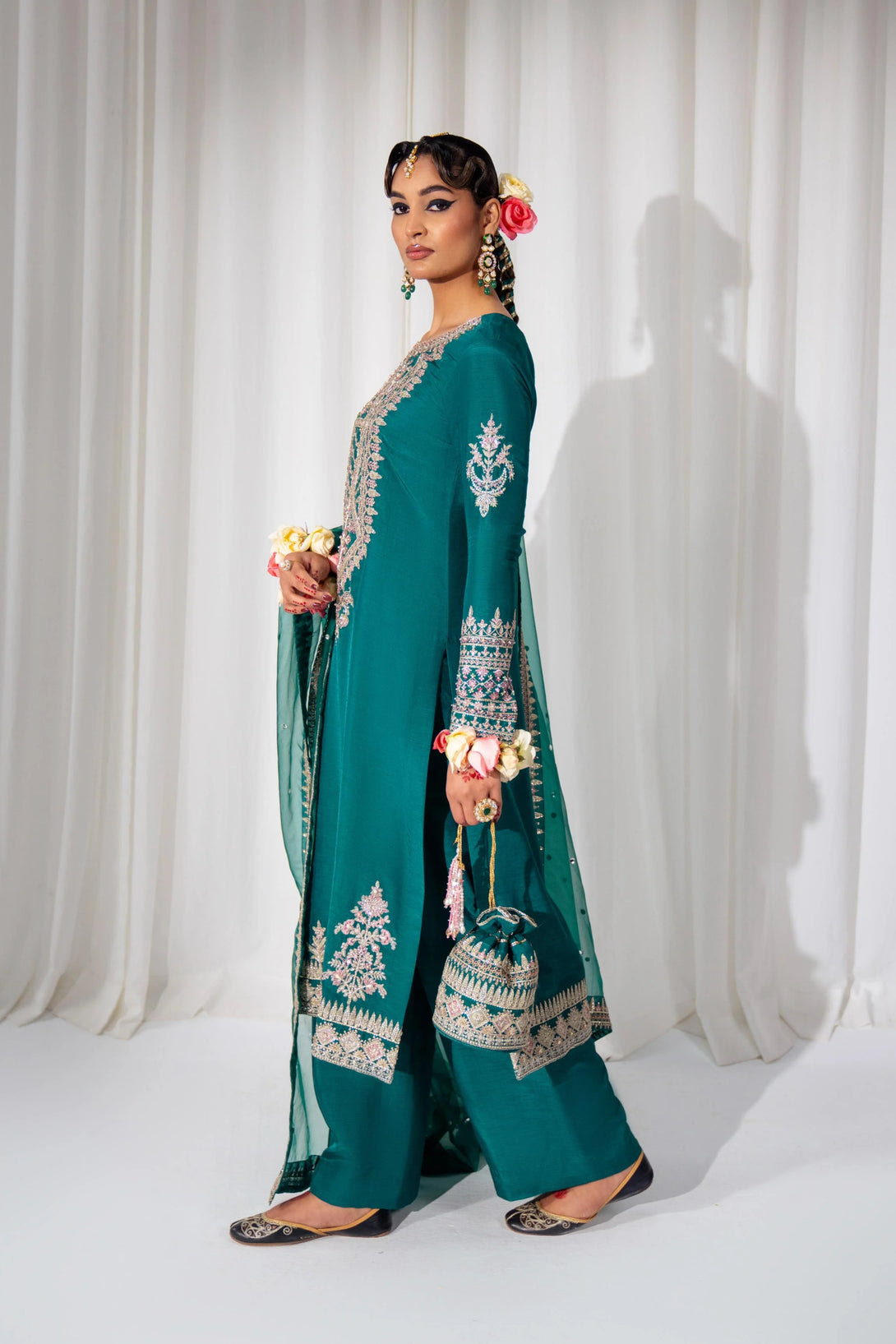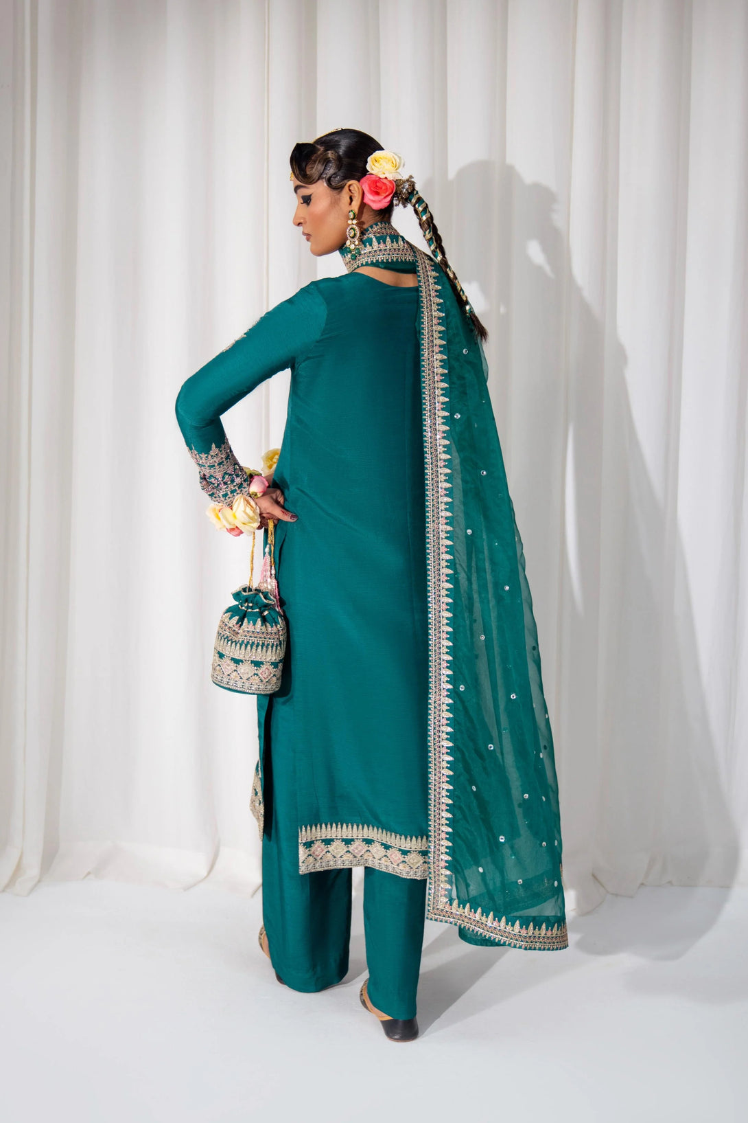 This dark green set includes a rawsilk shirt adorned with blingy sequinned embroidery and intricate hand embellishments, exuding festive charm. It is paired with a sleek, plain trouser for a balanced look. The ethereal organza dupatta, featuring a dazzling diamante spray and delicate thread and sequin embroidery along all four edges, adds the perfect touch of glamour. Complete your look with a matching potli bag for a timeless festive statement.