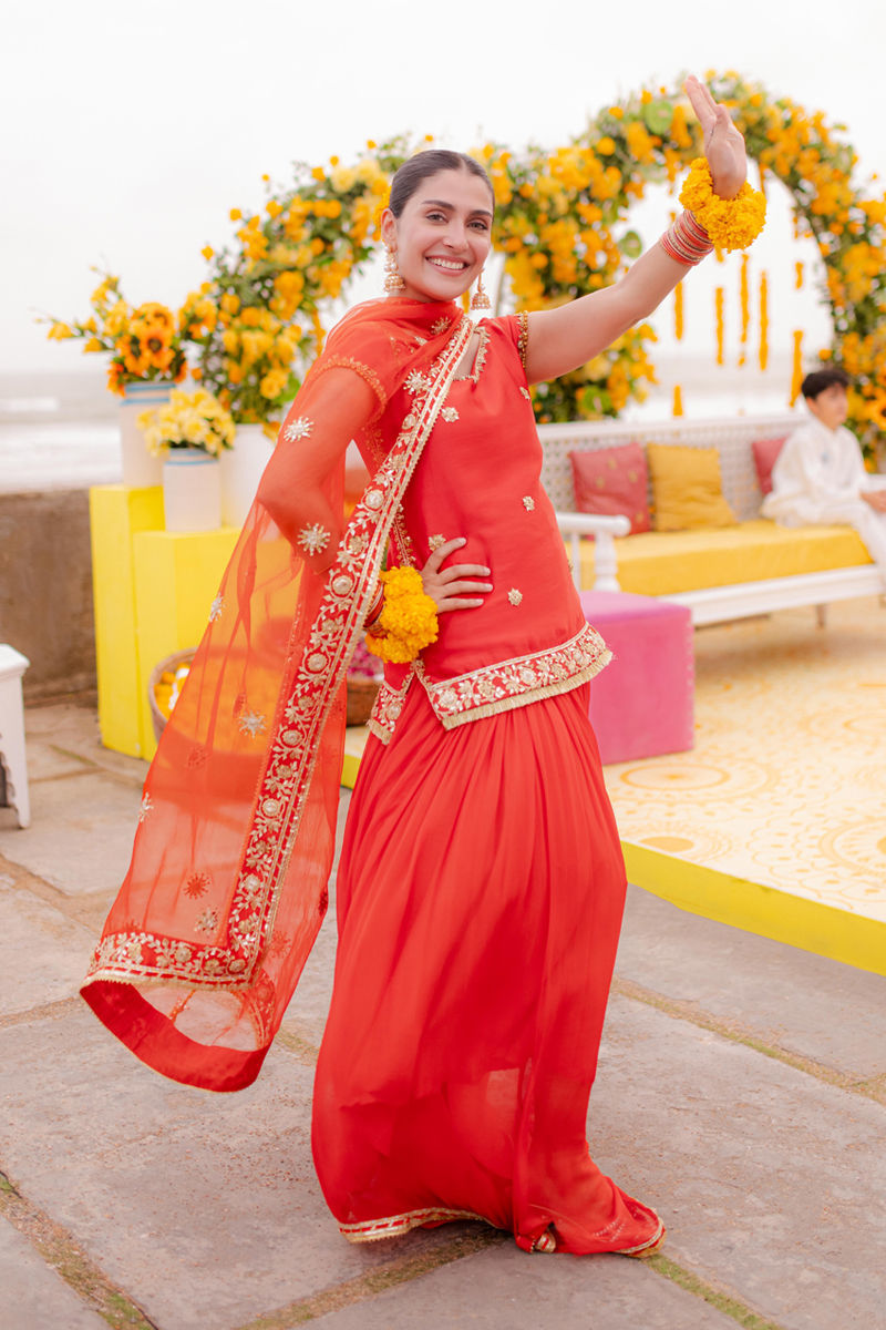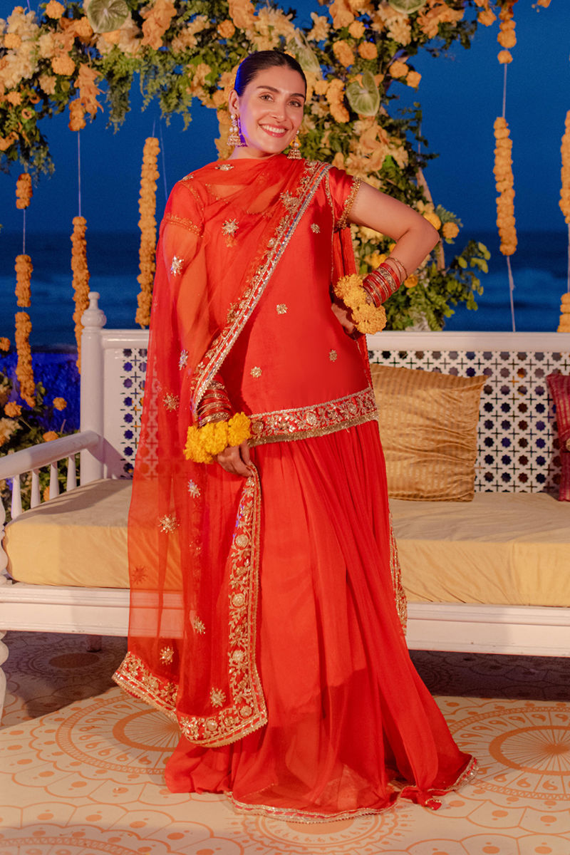 A super vibrant silhouette perfect for the upcoming season in this beautiful colour, it feathers a short shirt with gota handwork paired with a chiffon two legged skirt. The stunning duppatta is the main highlight with heavy embellished handwork on all four sides with tassel details.