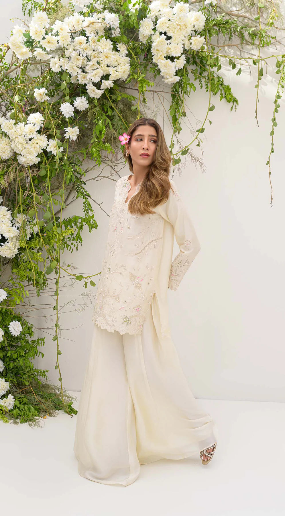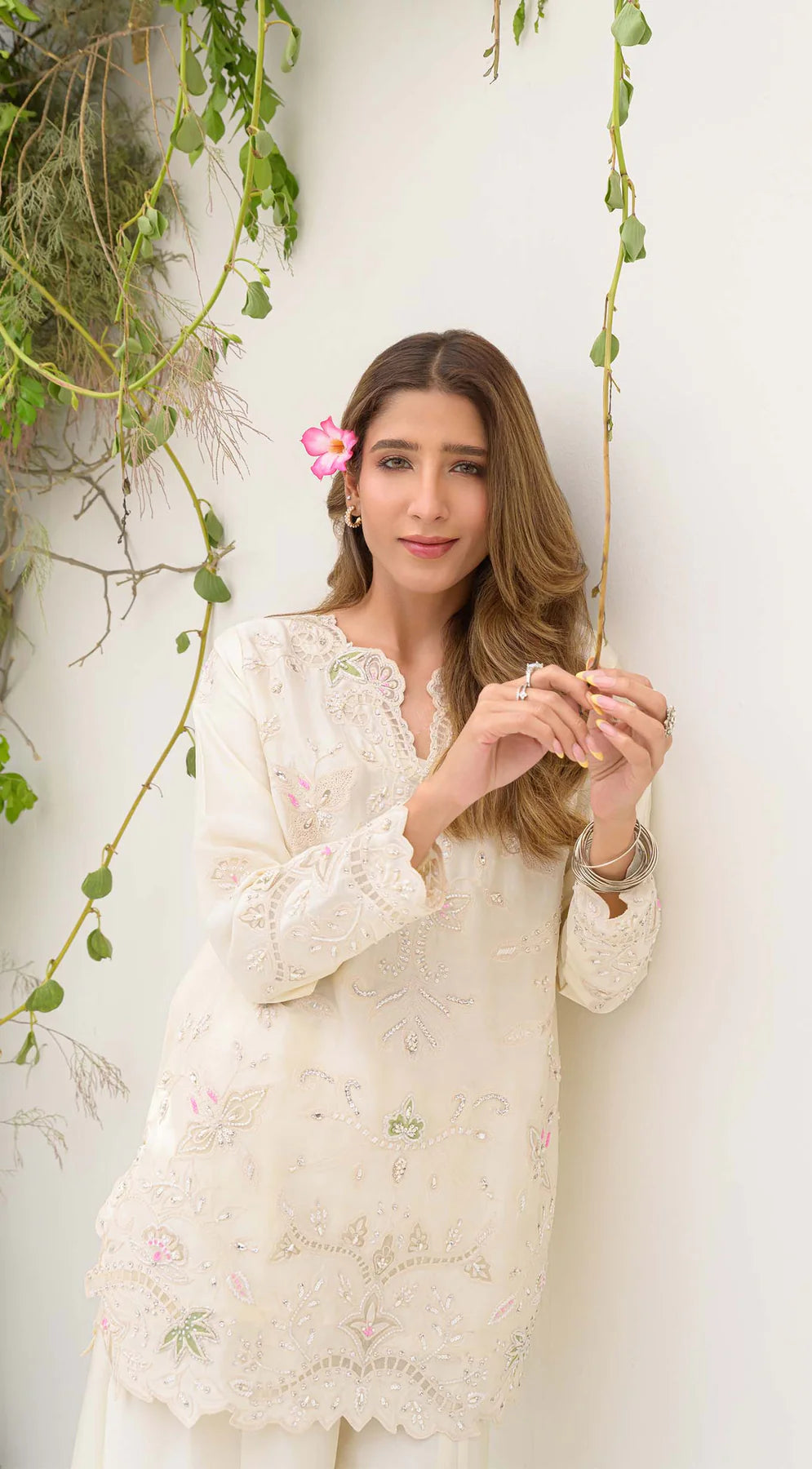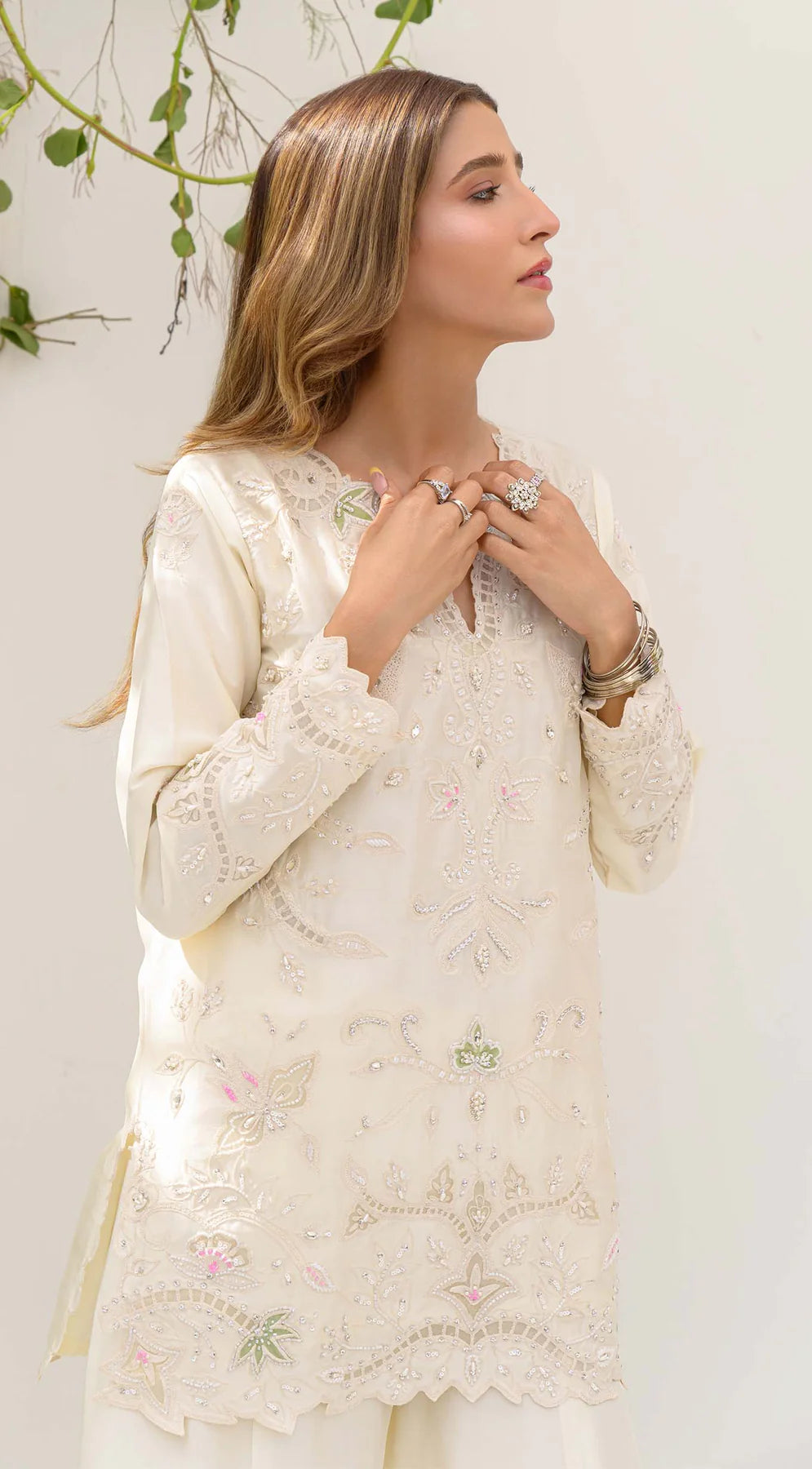 Elegant white silk outfit with intricate cutwork and embroidery, adorned with sitara, moti, and stones. Delicate floral motifs feature mint green and pink appliqué. Paired with izar pants, this ensemble exudes refined beauty and sophistication.