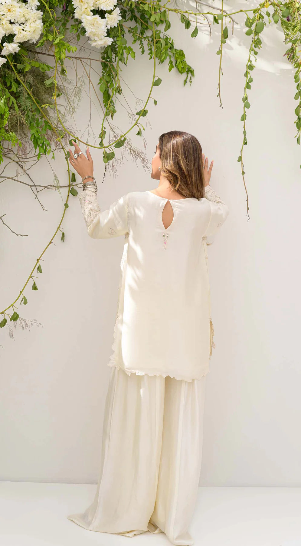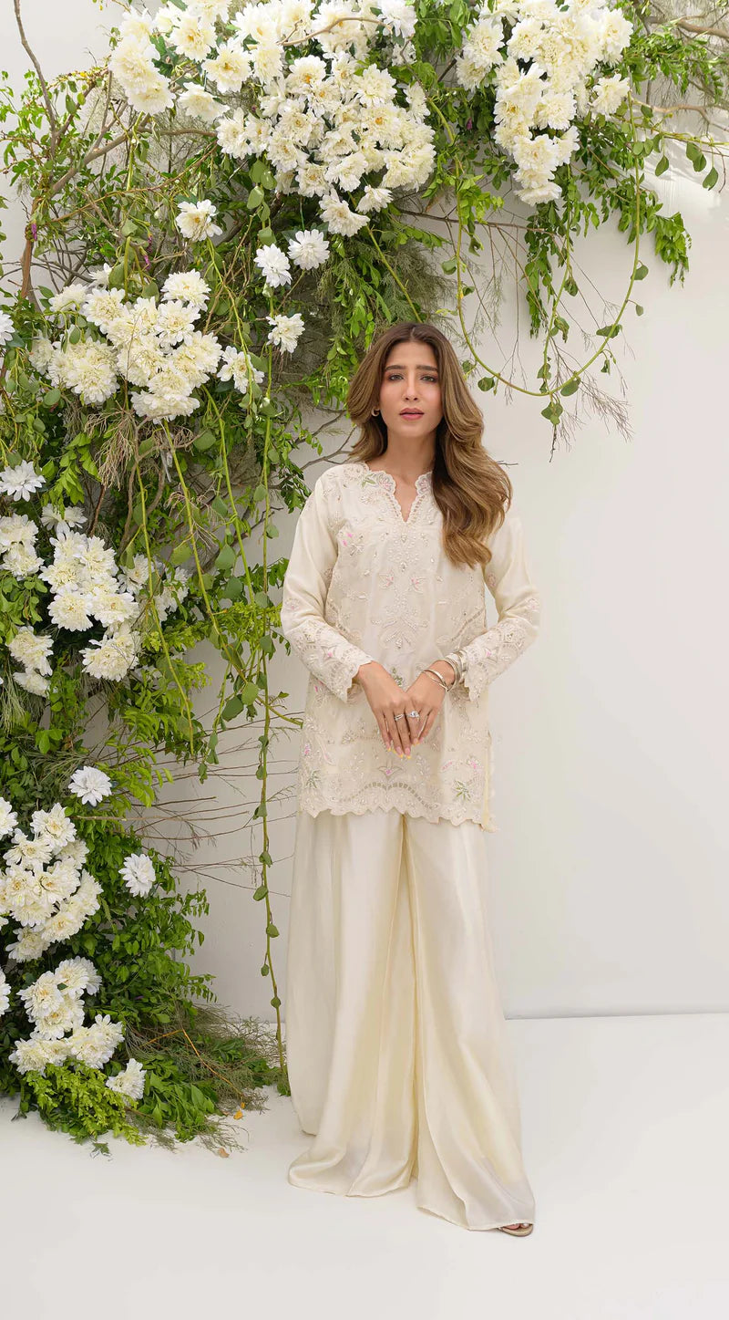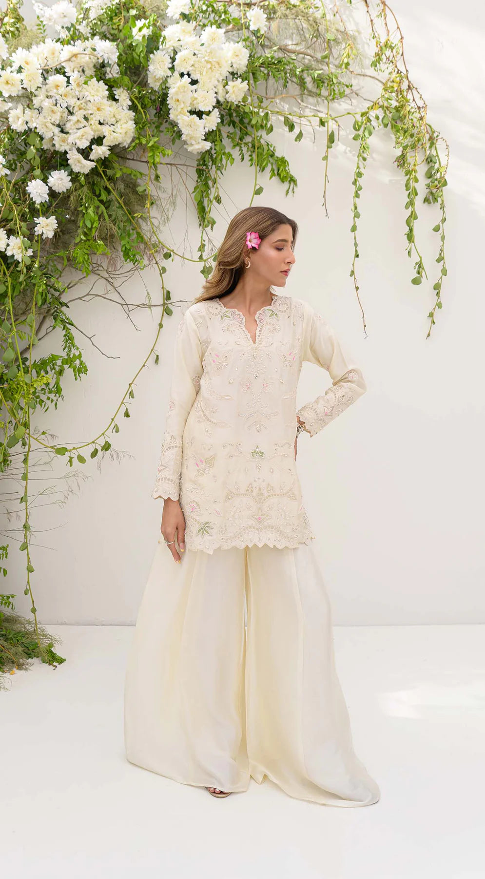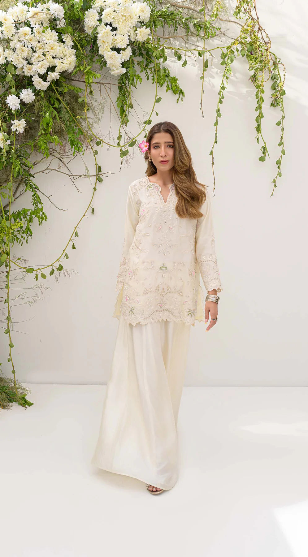Elegant white silk outfit with intricate cutwork and embroidery, adorned with sitara, moti, and stones. Delicate floral motifs feature mint green and pink appliqué. Paired with izar pants, this ensemble exudes refined beauty and sophistication.