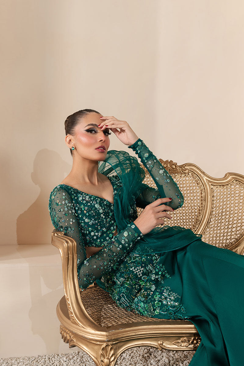 This captivating outfit features a striking fish-cut lehenga, its silhouette designed to enhance the figure with a graceful, elongated shape that moves with elegance. The lehenga is adorned with intricate, modern embellishments that shimmer with every step, creating a dazzling effect. Paired with a contemporary Indian blouse, the design showcases bold, stylish lines that contrast beautifully with the traditional elements. The highlight of the outfit is its stunningly crafted modern back, featuring intricate detailing that adds a touch of sophistication and allure.This ensemble is a perfect fusion of traditional craftsmanship and modern fashion, making it an unforgettable choice for any elegant occasion.
