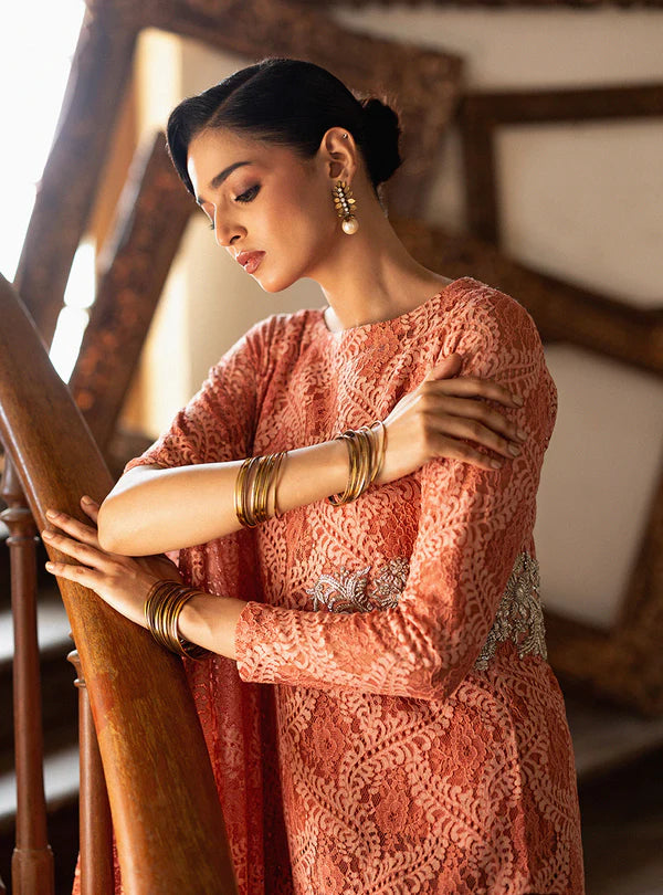 An outfit that makes you feel instantly light, confident, and utterly sophisticated. The top is cut in a fluid, cape silhouette from a delicate Blush-Toned Chantilly Lace which drapes beautifully and gives your movement an ethereal quality. This soft texture is elegantly grounded by a striking silver hand-embellished, placed to define your waist with a precious shimmer. Paired with perfectly tailored flared trousers in a rich, complementary rust tone.