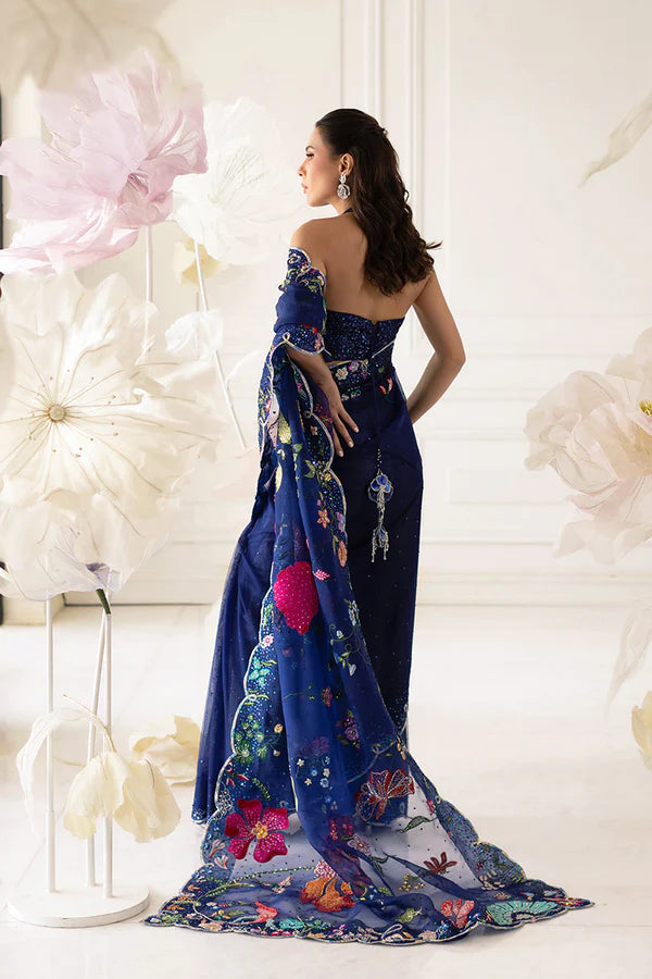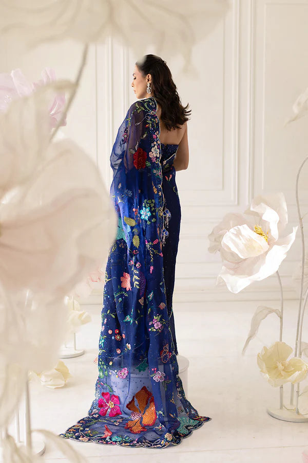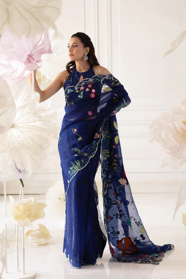 This exquisite navy blue saree from Mina Hasan's Dholki Collection captures the glamour of a starry night with its sheer fabric and vibrant, multi-colored floral embroidery. The delicate botanical kaam flows elegantly across the net, complemented by a chic, embellished halter neck blouse that adds a modern allure. Perfect for a festive event, this ensemble offers a striking blend of traditional craft and contemporary sophistication.