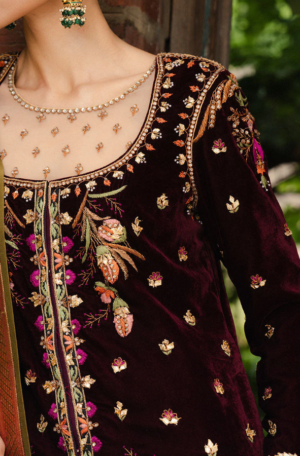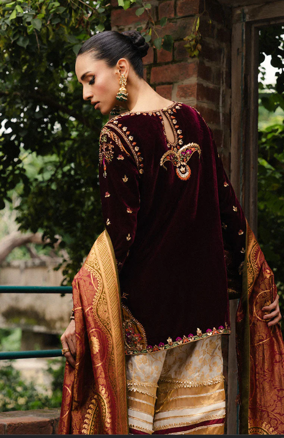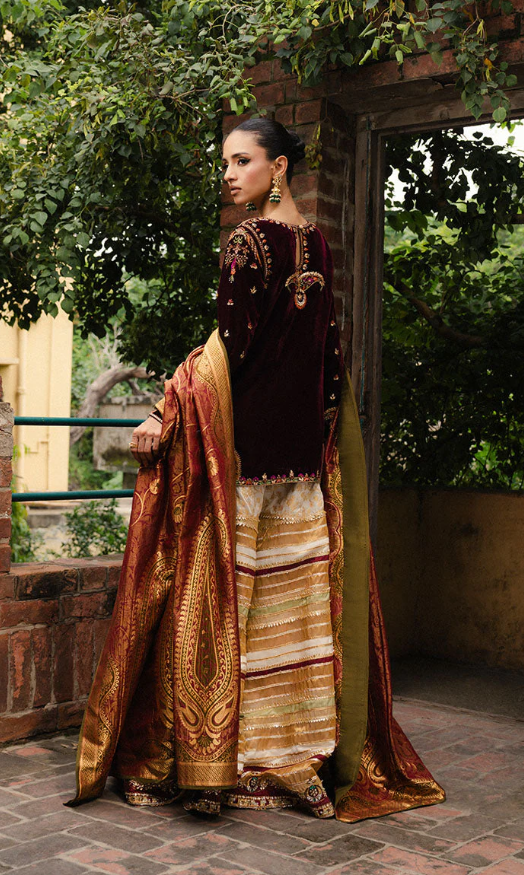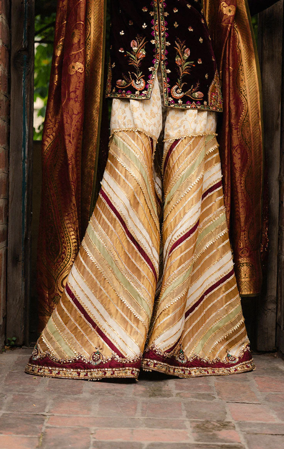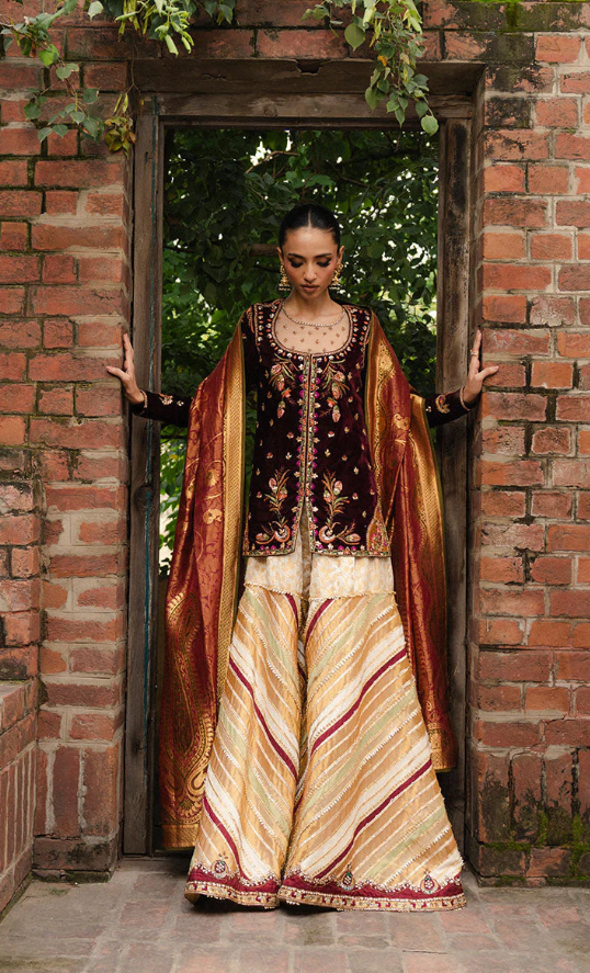 A regal ethnic ensemble featuring a chatta patti detailed sharara paired with a short choli cut blouse, intricately adorned with delicate ethnic embroidery and embellishments. The look is elevated with a classic Aneeka Ruknuddin banarsi chaddar, handwoven by skilled artisans. This custom shawl adds an aura of grandeur, making the outfit a statement for qawwali nights and festive gathering.
